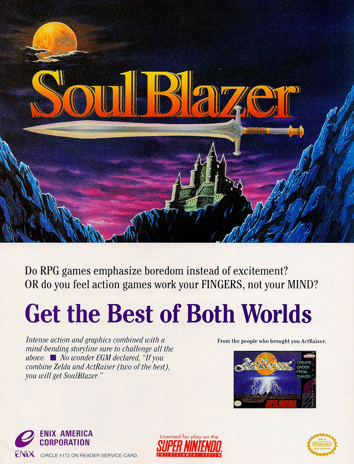 Soul Blazer is the answer for you Zelda fans who need more excitement. It may not be better, but at least you can entertain yourself for about four hours or so. Soul Blazer features excellent graphics and music, but lacks in quest depth. Look around for its shelf appearance and snatch it up while it's still hot! Worthy!