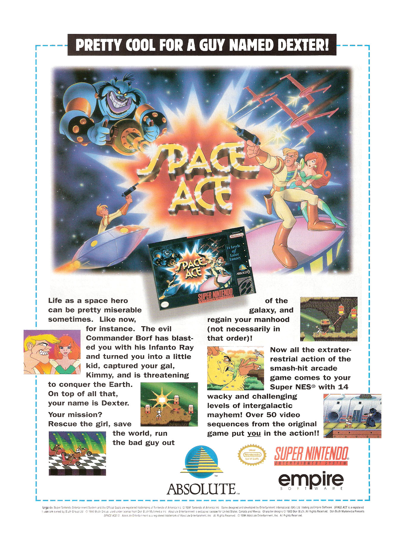 How many of you remember the old laser disc game Space Ace? It came out roughly about the same time Dragon's Lair and Cliffhanger. Now a brand new version of this game is coming out for the Super NES. It is a conversion on par to how Dragon's Lair was done.