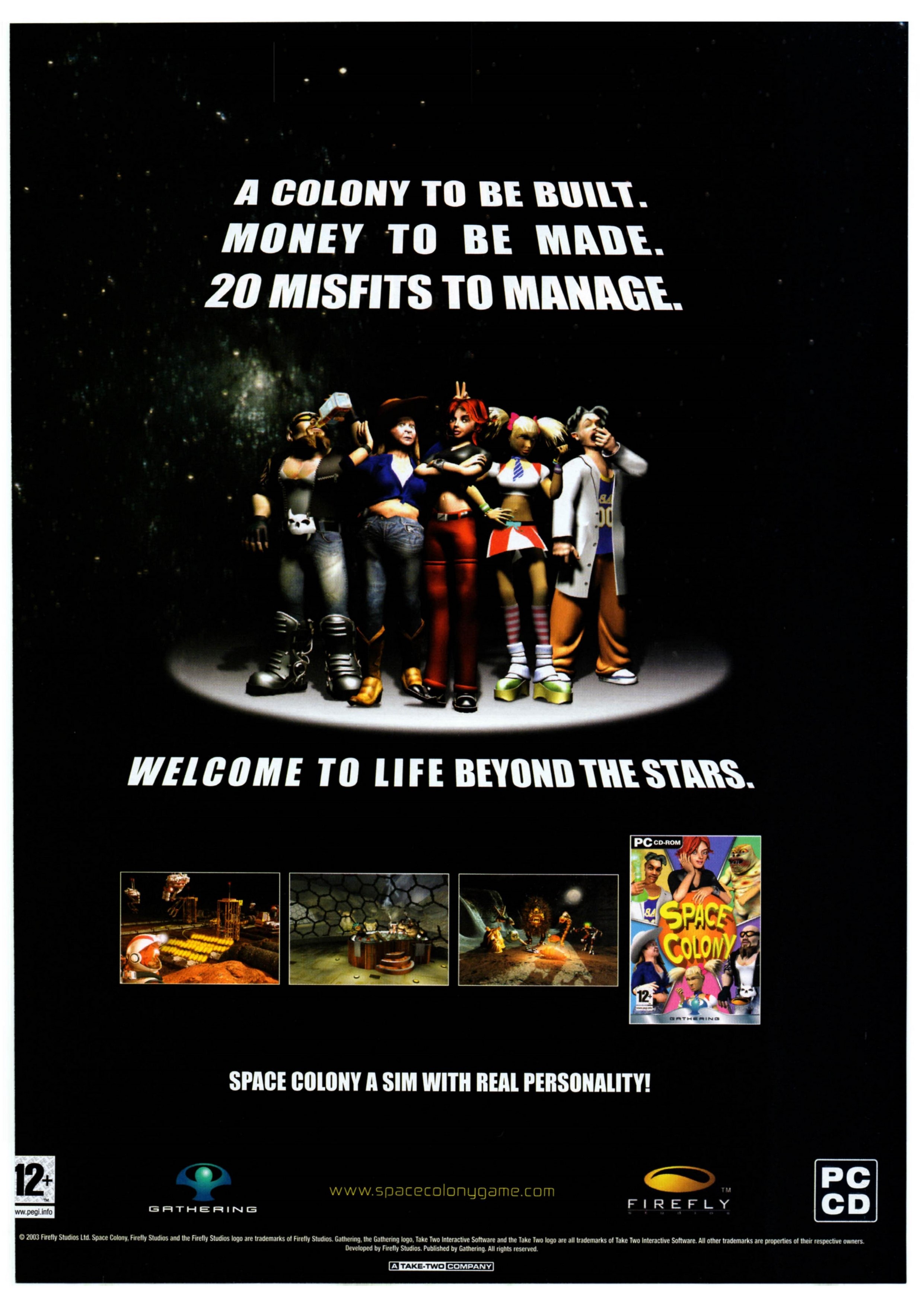 "We see the human side of gaming being a big growth area," explains FireFly's Director Simon Bradbury. "You might be used to having a hundred workers in a castle to deal with, but in Space Colony a stiff challenge might be 10 people. You're going to have to get to know those 10 people well, because they're all cooped up in a small space. It's not just about feeding them, it's about maintaining their needs -their needs for hygiene, their needs for social interaction and relaxation, plus which characters get on with each other and which don't."