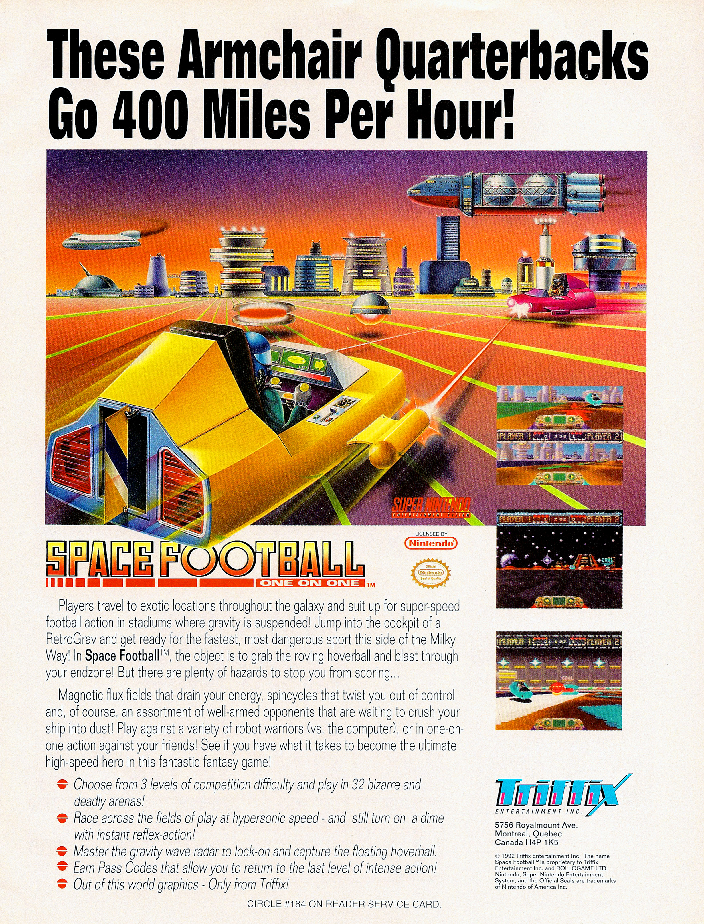 Space Football is a blast as a two-player foray into the realm of the absurd, but more detail would have made this game a candidate for your instant classic collection. Instead, this is an inventive and fun game that offers enough challenge and wowie-zowie graphic effects to make you play it often. The fastest sport in the universe will grab you by the laces and take you for a spin.