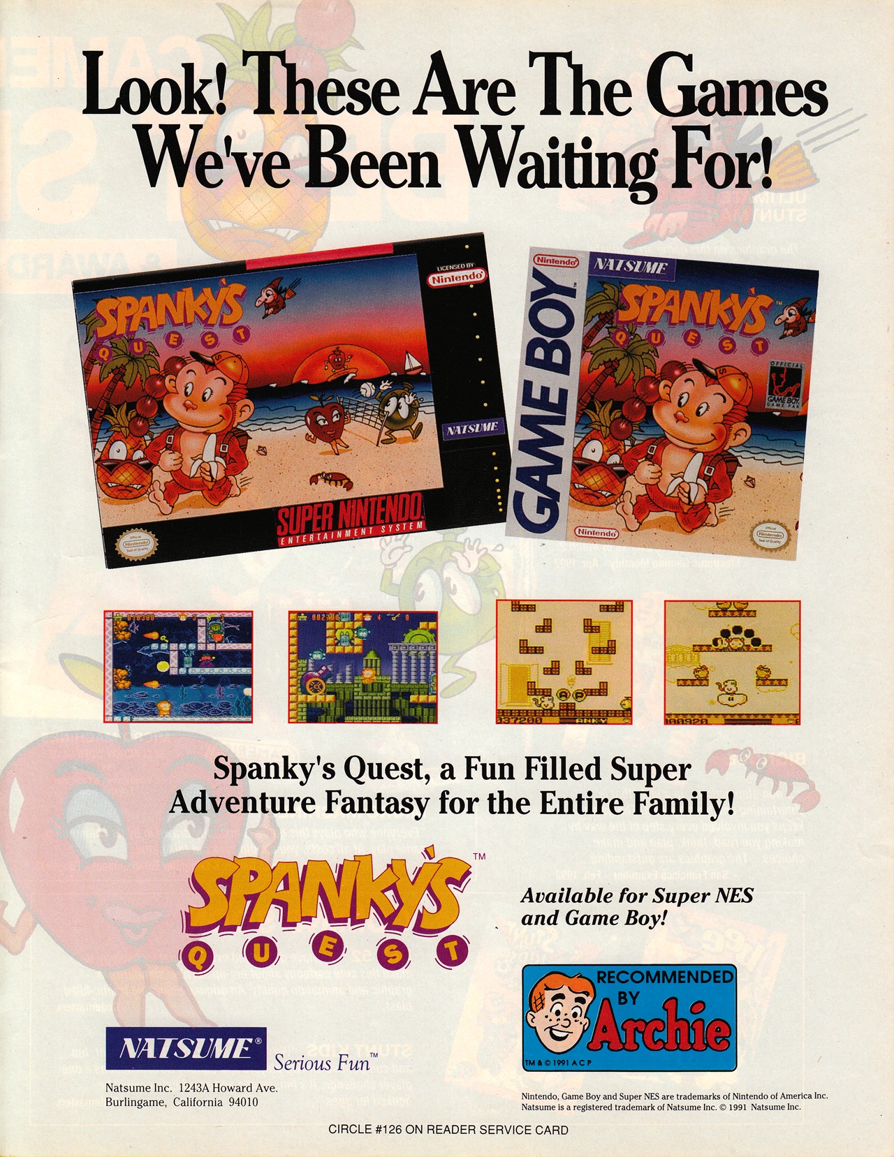 Natsume's newest game for the Super Famicom is Spanky's Quest. You are a mischievous monkey who must travel through many lands looking for keys to the exits. Look for the 1 ups and secret rooms scattered throughout the game. The bosses are large and very tough! Spanky's Quest will be available to U.S. players soon!
