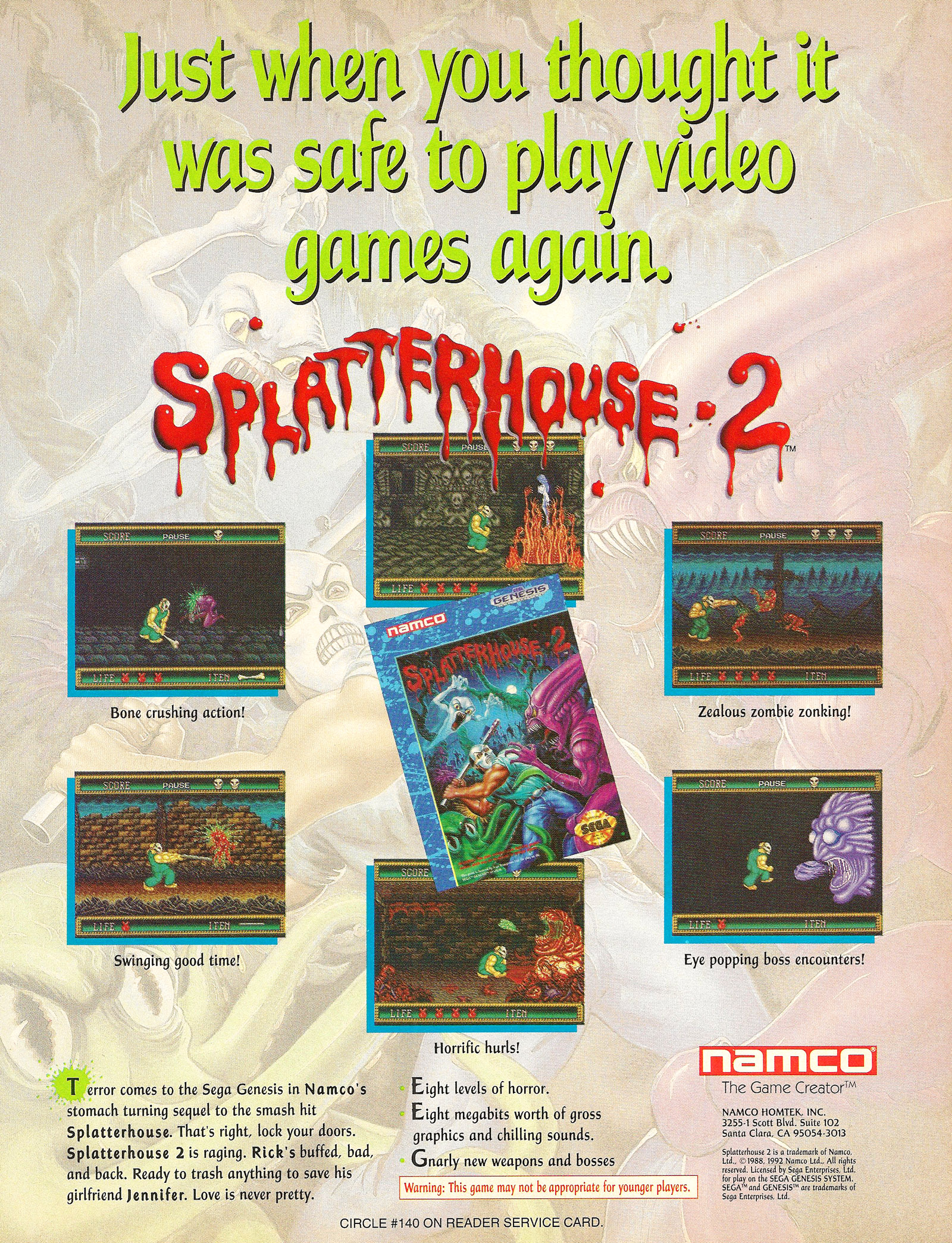 If you missed out on the fun of the original Splatterhouse, don't miss out on Splatterhouse 2. It's a bit on the gooey side, but don't let that bother you. If you can't appreciate Splatterhouse's gross- out factor, you can surely appreciate its other redeeming qualities, which include awesome graphics, neato sound effects and music, mondo challenge, and nonthumb-threatening character control.