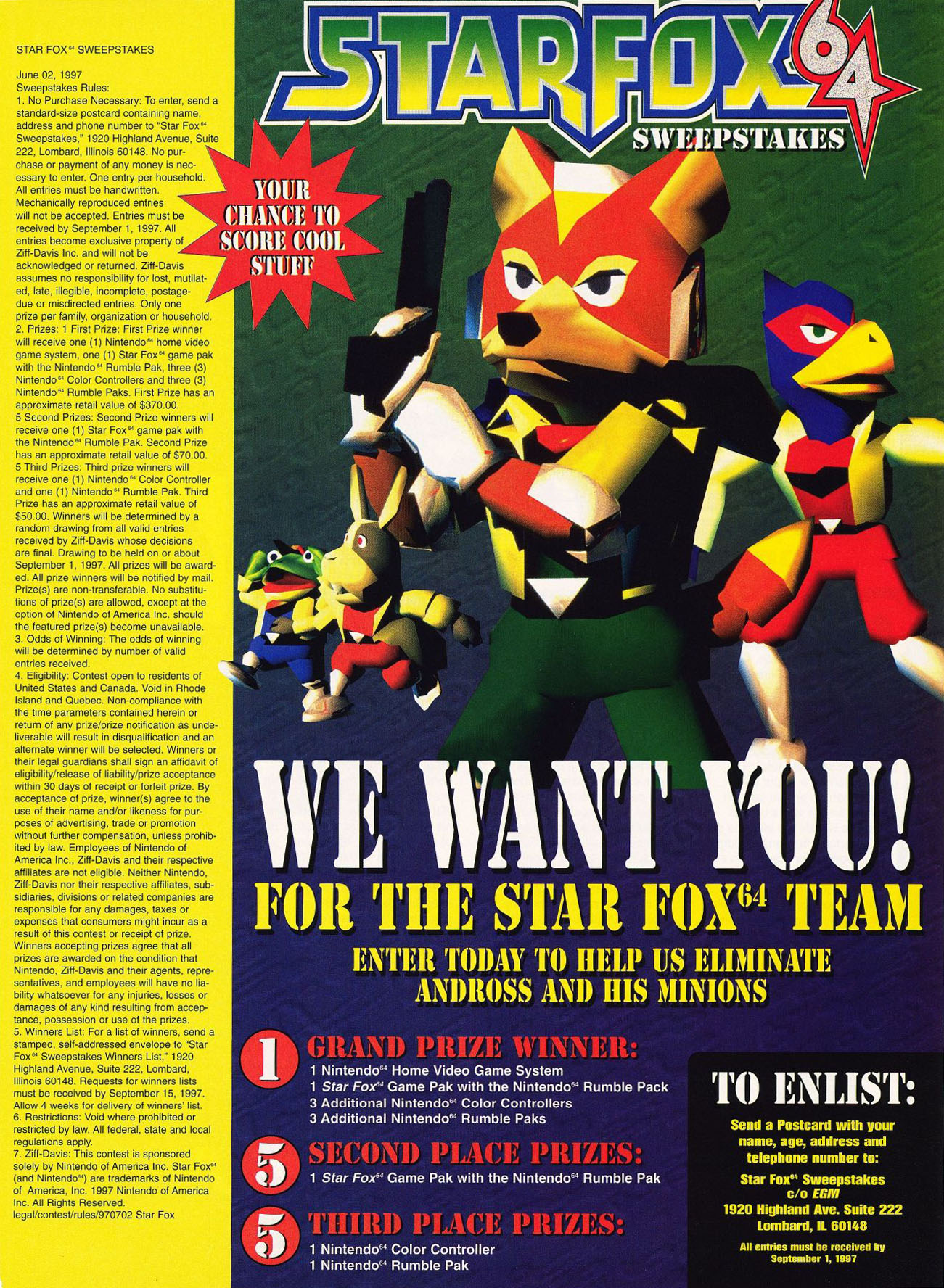 It took me about 10 minutes of wild teetering and tottering in my seat to figure out that StarFox 64 is an even better game than its 16-Bit predecessor. What we have here is the ultimate twitch shooter. Its screenfuls of enemies and onrushing obstacles never cut you and the rest of the McCloud clan any slack. OK. so the original StarFox was relentless, too. but this sequel gives you a hell of a lot more to worry about. For starters, your wingmen (yes. that would be the cloyingly cute trio of Peppy. Falco and Slippy, as well as a few new furry faces) are no longer expendable; each contributes something to the mission and is worth protecting-even if they do get in trouble way too often. Let Slippy buy the farm, for instance, and you won't be able to see the life gauge of Bosses (a real shame, since it'll probably be every gamer's fantasy to whack Slippy, who sounds as if he's voiced by a 6-year-old girl). And only Falco can lead you to the secret areas scattered throughout each level. Starfox fans wanting a little more freedom this time around may be disappointed that most of the game's 15 levels still stick your Arwing on rails, but at least now the track is wider, giving you more room to maneuver. And a few levels-namely the Boss stages-do switch to a fly-anywhere mode. While these stages are OK, they're not as exciting as the railed levels, which toss more enemies and obstacles in your path. Graphically, the game looks as good as we expected, although large enemies look pixelated when they're far away. Starfox 64's $80 price tag is steep (at least for a first-party N64 game), but don't forget that the Rumble Pak is included. and this little ticker is worth the extra bean. The Pak's varying vibrations add more than you'd expect to the game's already excellent control (I was skeptical myself until the first time the pad started humming along in tune with my ship's afterburners). I only wished the Pak worked with Blast Corps. The game's only letdown is its Multiplayer Modes, which divide the screen into fourths even if only two people are playing. If you thought following the action in Mario Kart 64's four tiny screens were hard, try spotting targets-many smaller than a dime-in four-player StarFox 64. Yet I consider the Multiplayer Modes more of a bonus than a true part of the game. And besides, at least Battle Mode gives you an excuse to blast Slippy into slimy green pieces.