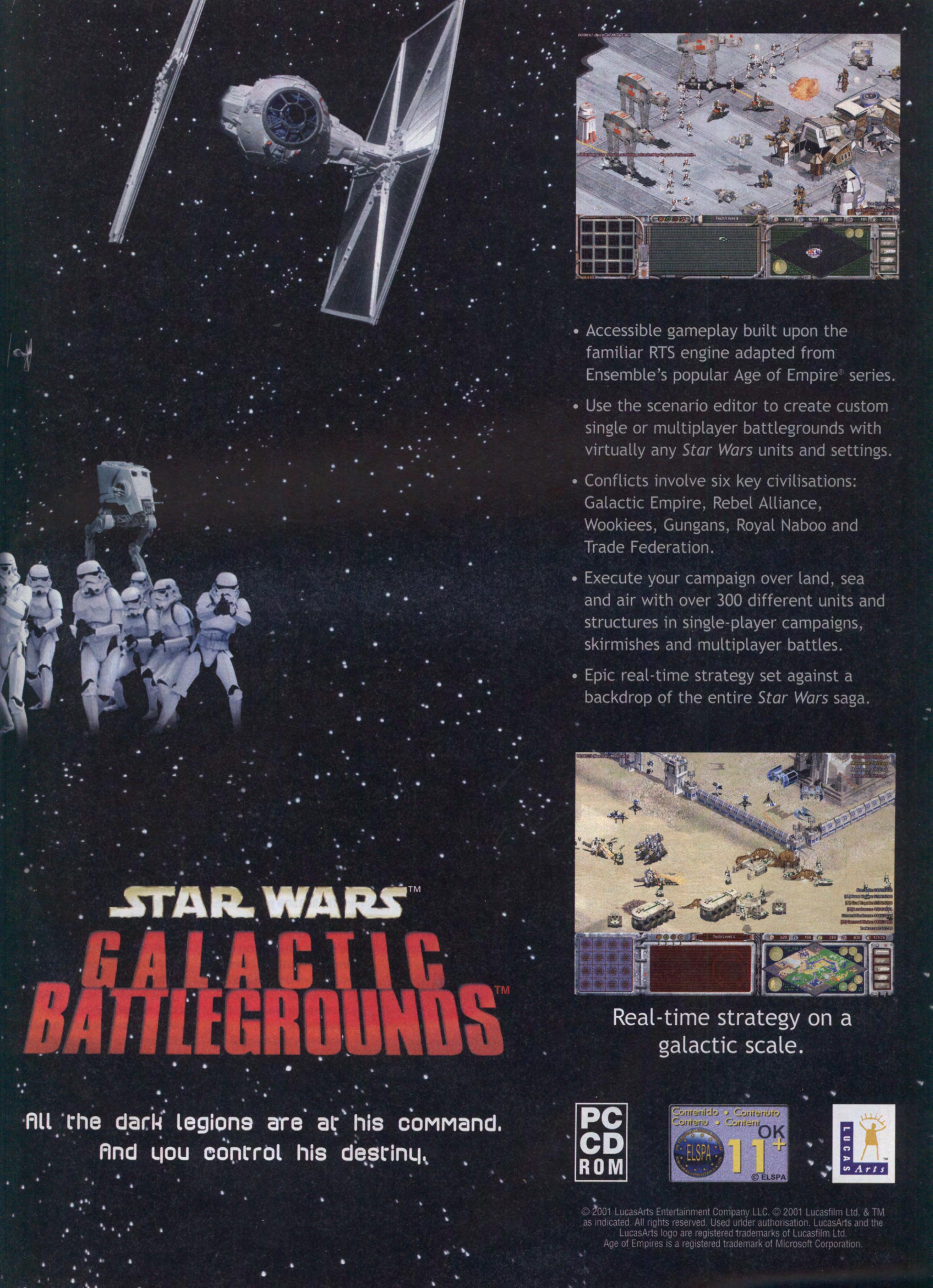 Galactic Battlegrounds (GB) is the junction of two successful entertainment franchises, one for the PC and one for silver screen. It's the marriage'and a happy one'of Microsoft/Ensemble Studio's Age of Empires (AoE) series of ancient war games and George Lucas's Star Wars films. You, the player, will also be happy because you're getting the stability of an established mature game engine and a lush science fiction universe that has become a part of modern folklore.