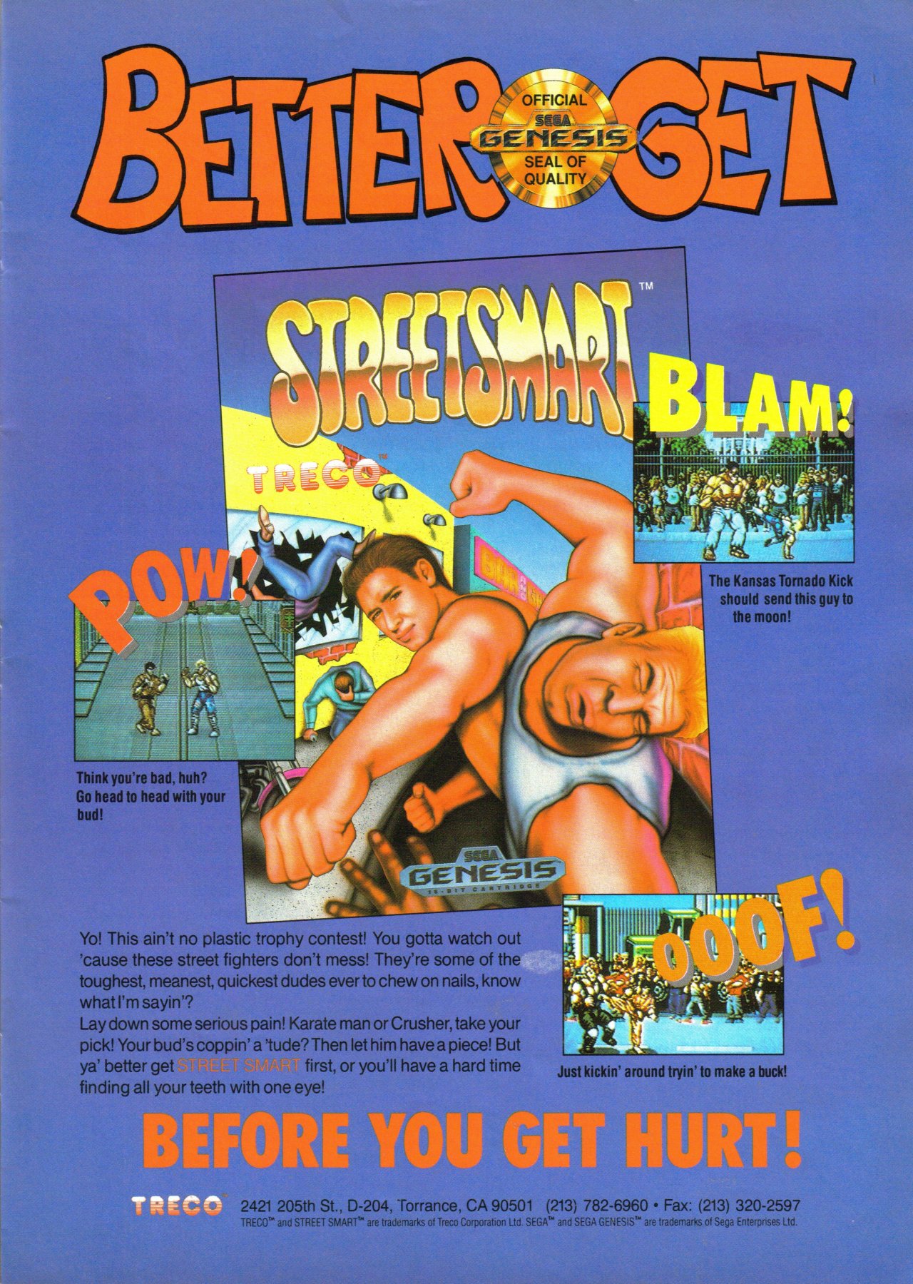 Chop! Kick! Slam! Street Smart from Treco will send you reeling! Using state of the art technology, Treco utilizes the high tech graphics and sounds of the Genesis to create a nine-level slugfest translated from the coin-op original. All of the moves are retained from the coin-op, as well as both hero character and their specialized attacks. Do you think you can take on Mr. Big in his penthouse? Good Luck!
