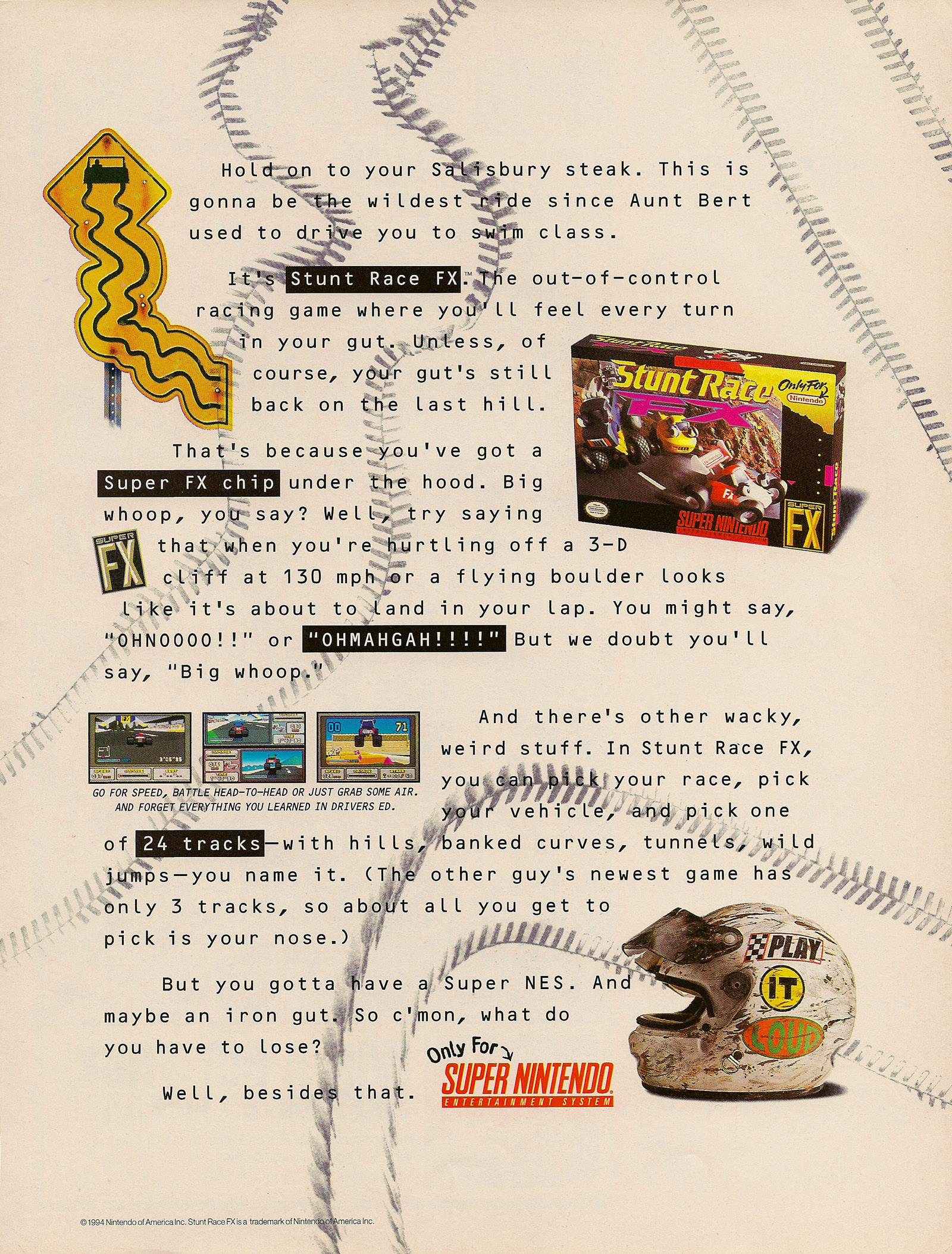 Keep your eyes peeled for this one folks! Stunt Race FX promises to be one of the most anticipated games of '94!