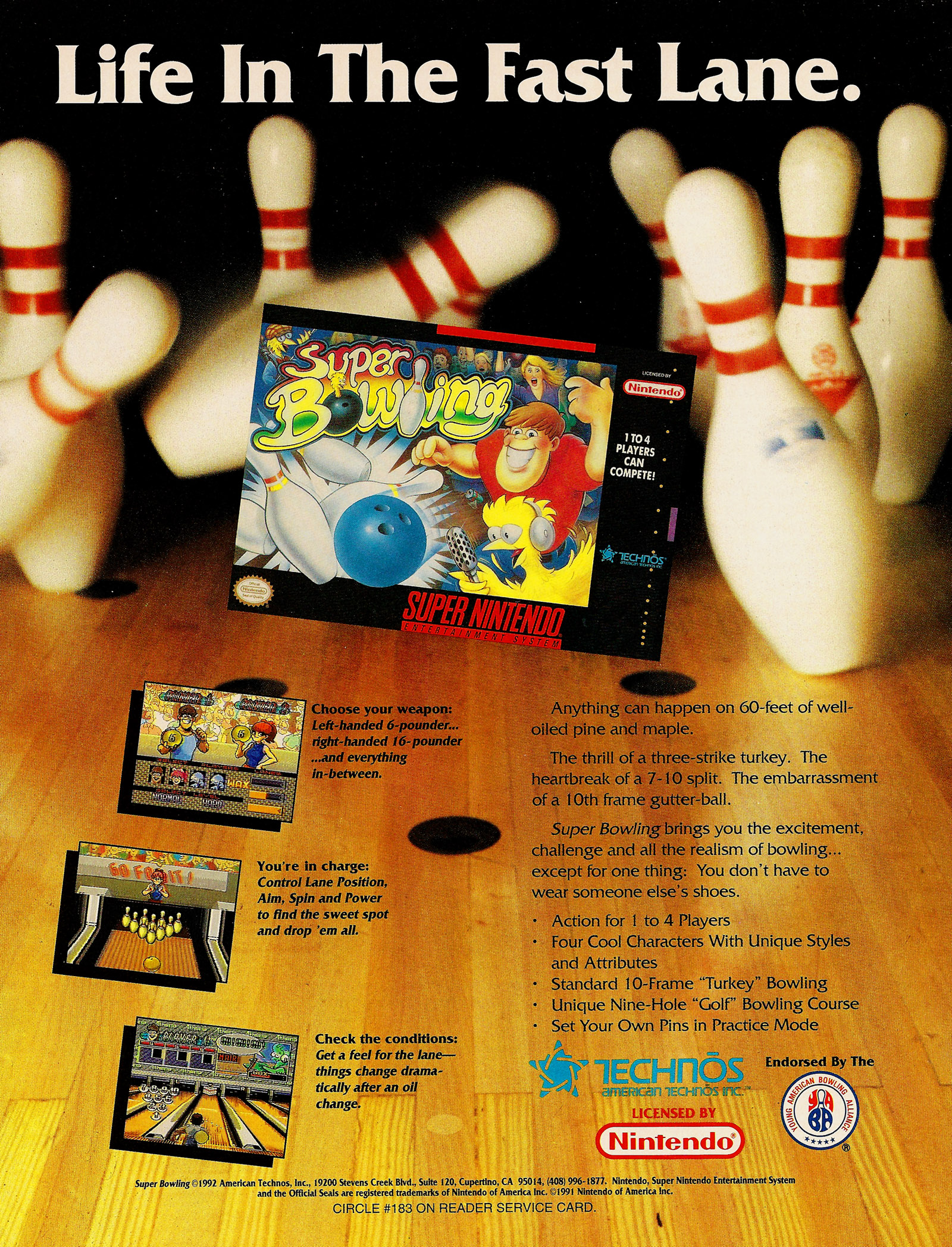 Super Bowling has a few cool features, I like being able to pick the different bowlers who are right or left handed. The game play is OK and easy to get used to. The multi-player mode is really cool when 4 people are playing. More should of been done with Mode 7 but as a whole this cart is fun to play.