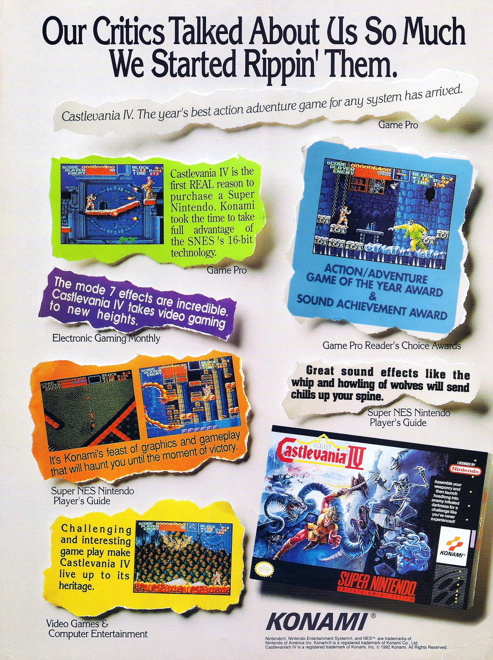 Konami brings you the fourth installment to the Castlevania series. This looks like it's the best one yet! Incredible graphics and sound enhance the classic Castlevania game play. New weapons too.