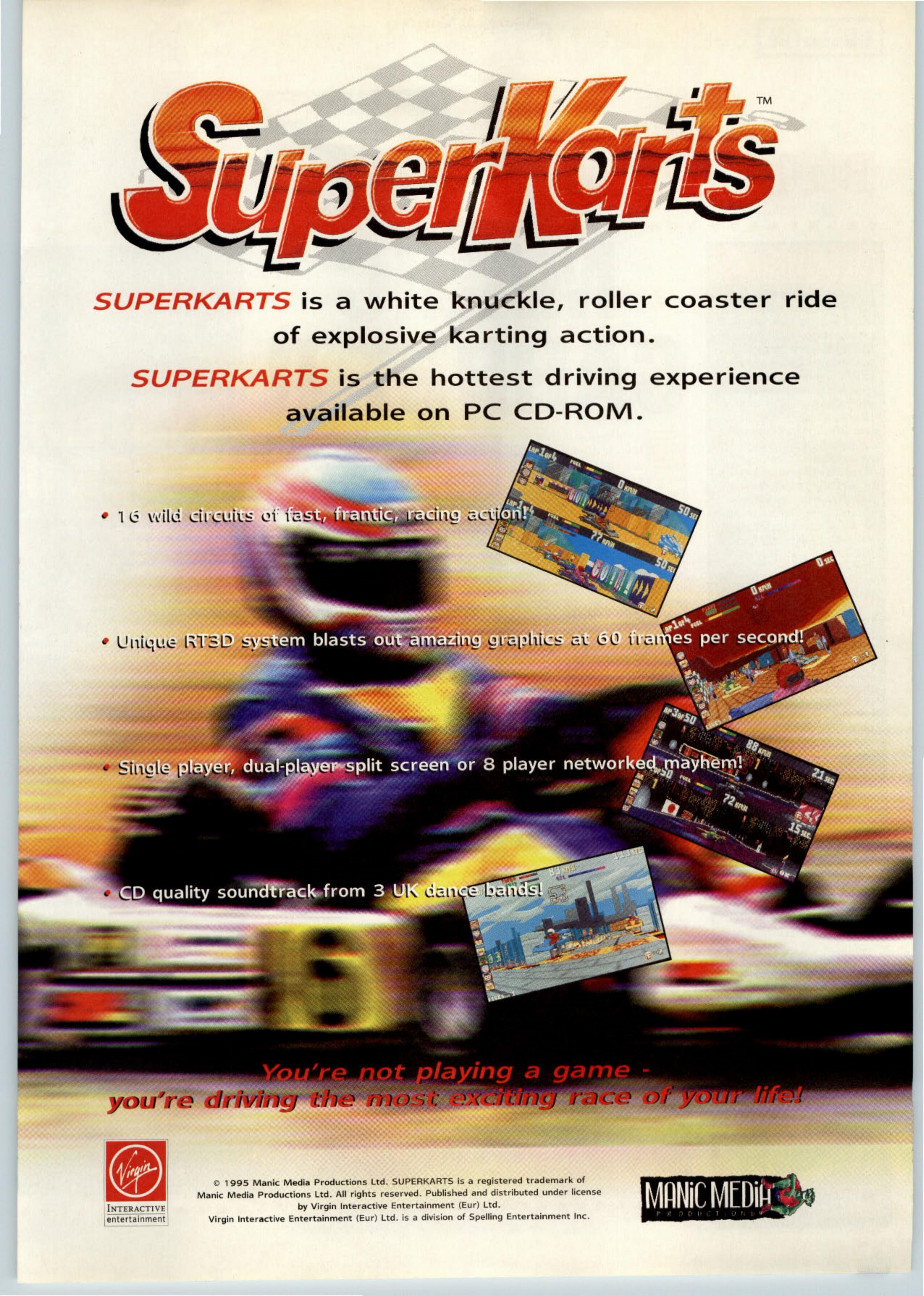 If you're lucky enough to have a cd-rom drive and have bought the cd-rom version of this magazine then you will probably already know how utterly brilliant SuperKarts is having played it on our exclusive demo (if you haven't, go and play it now and then finish reading this a bit later). If, on the other hand, you haven't got a cd-rom drive, your best friend who has got one has gone on holiday and hasn't asked you to water the plants or look after the cat and you can't "borrow" their machine, then Bummer!