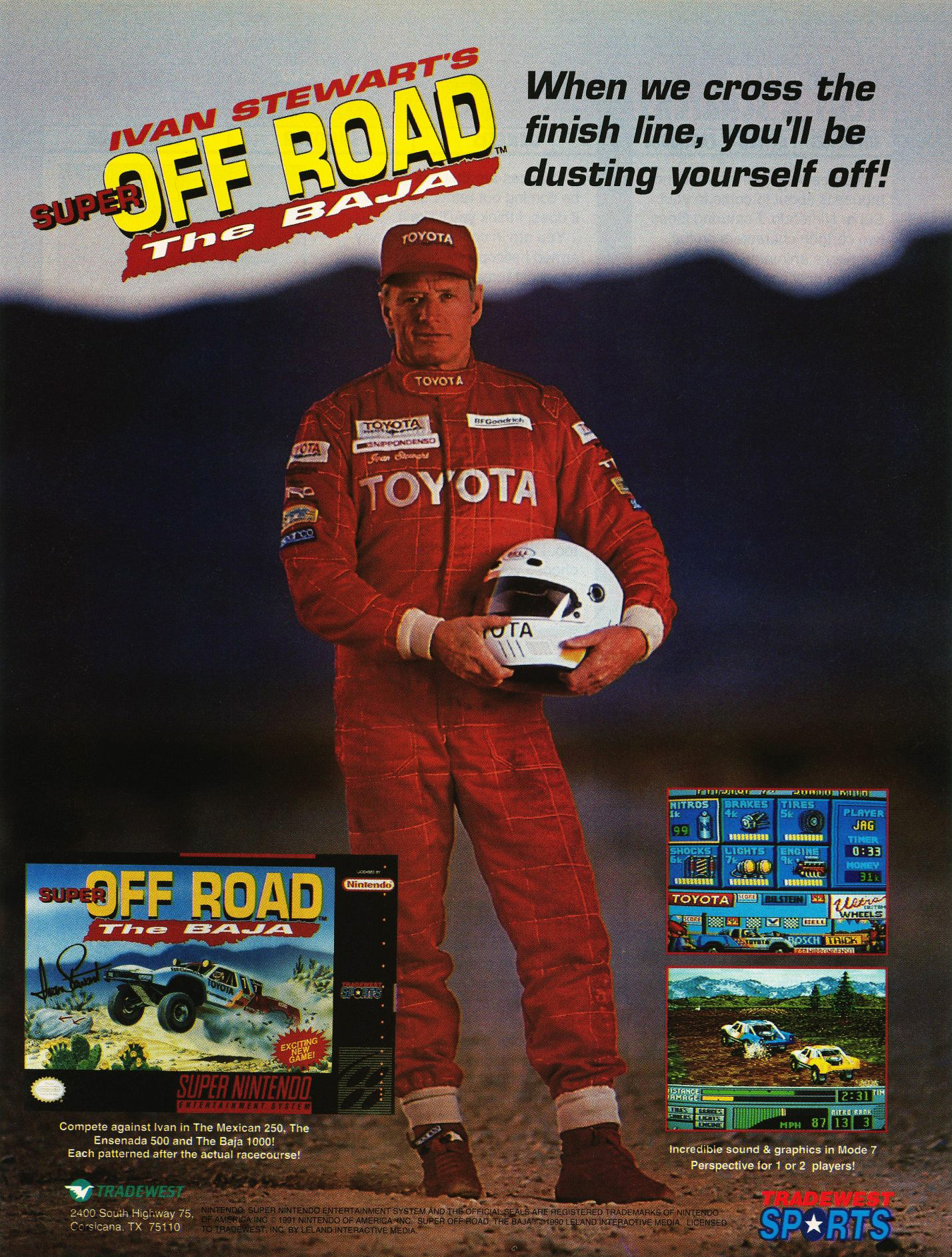 Super Off Road, The Baja is a rough-and-tumble auto-racing game that's sure to rattle your SNES psyche. You use a behind-the-vehicle perspective to drive a state-of-the-art Toyota four-wheeler down the length of the rugged Baja, California peninsula.