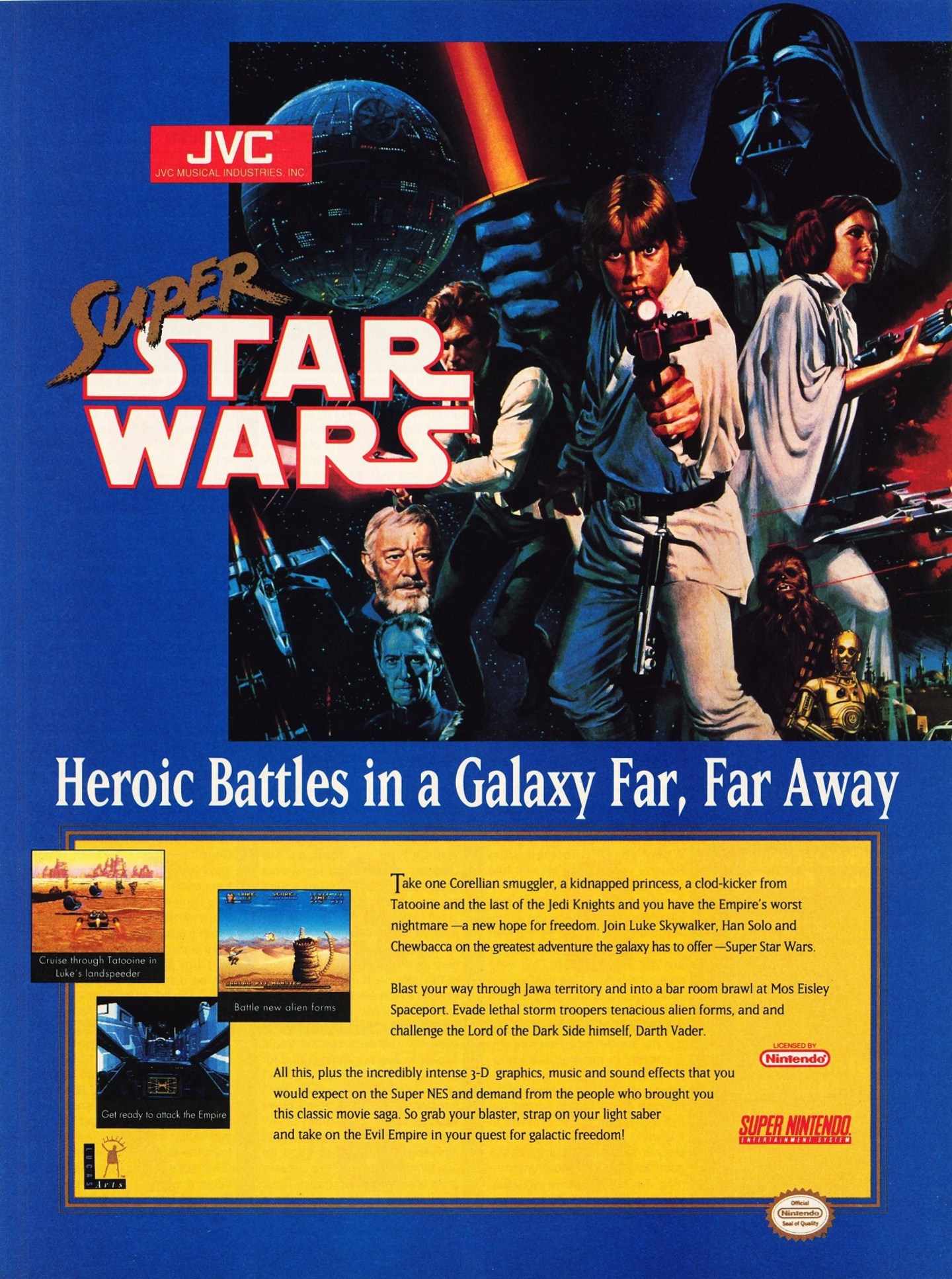 "Jake one Corellian smuggler, a kidnapped princess, a clod-kicker from Tatooine and the last of the Jedi Knights and you have the Empire's worst nightmare - a new hope for freedom. Join Luke Skywalker, Han Solo and Chewbacca on the greatest adventure the galaxy has to offer - Super Star Wars.