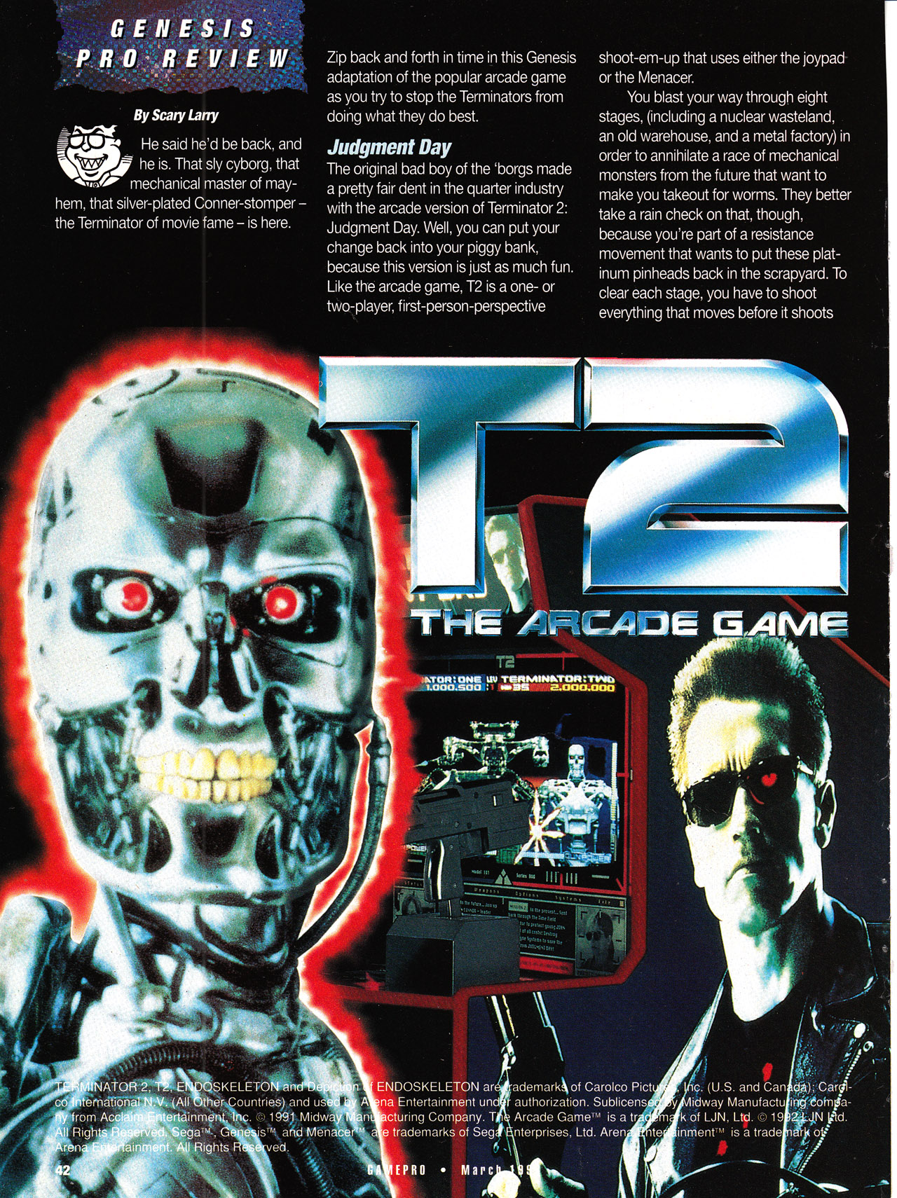 12: The Arcade Game by Acclaim is the latest conversion of the hit coin-op that burst through the arcades like machine gun fire last year. Once again, you're faced with the possibility of being an extinct species, thanks to a race of robots that's trying its hardest to exterminate you. For survival, you've joined forces with a small but determined resistance movement that is trying to protect its leader, John Conner, both in the present and the past. Need further clarification? See the movie.