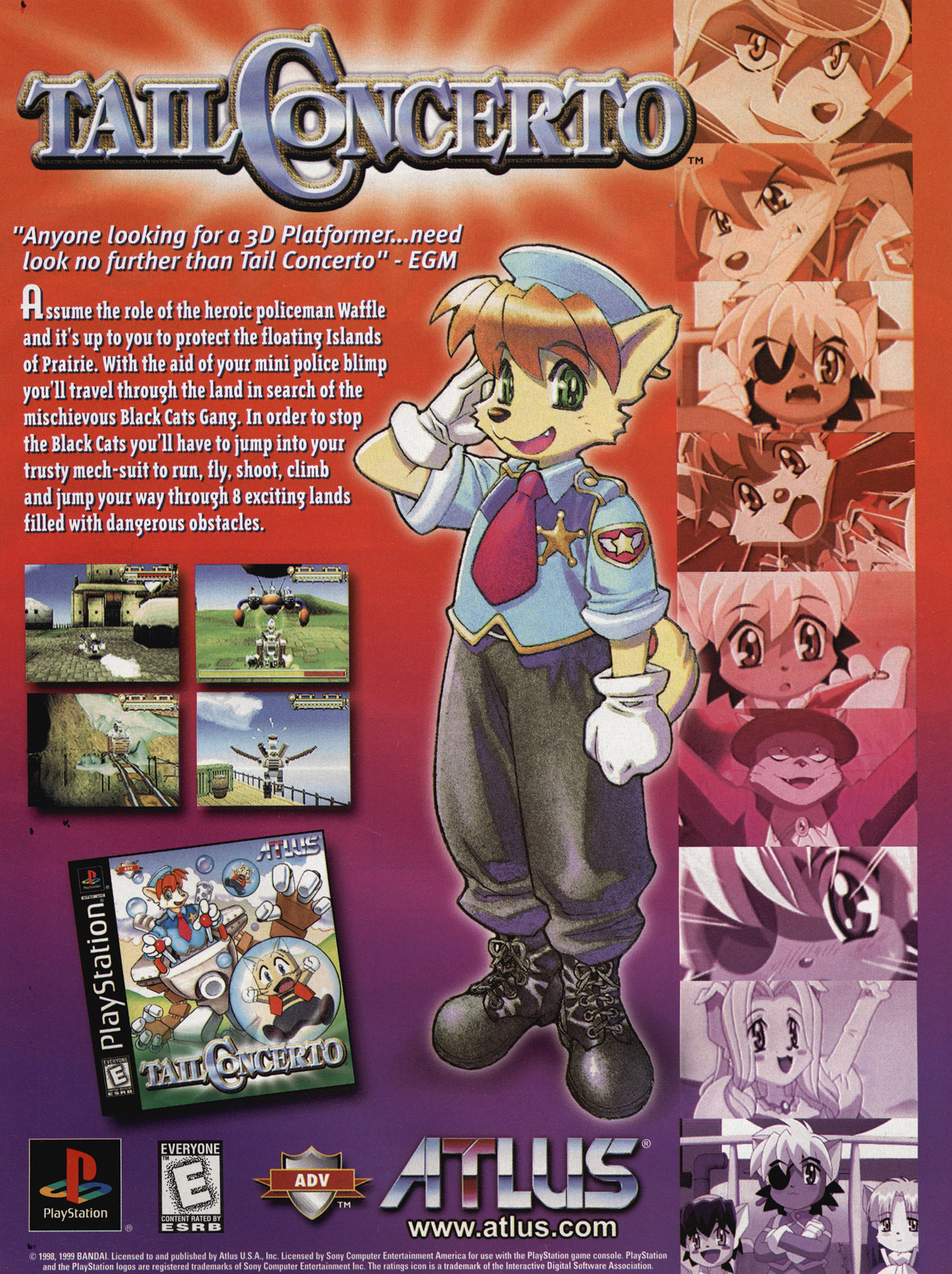 Originally scheduled for release last year by Bandai US, publishing duties have now changed hands to Atlus USA, who is attempting to broaden its domestic library through eclectic acquisitions (Guilty Gear, Bomberman Fantasy Race) and first-party localizations (Kartia, Trap Gunner, Persona). Tail Concerto marks Atlus" first major step into the 3D platform/action genre, and a significant step it is. While the game surely has a few issues, the overall quality of design and graphics is a considerable step up from developer Bandai Japan's usual fare.