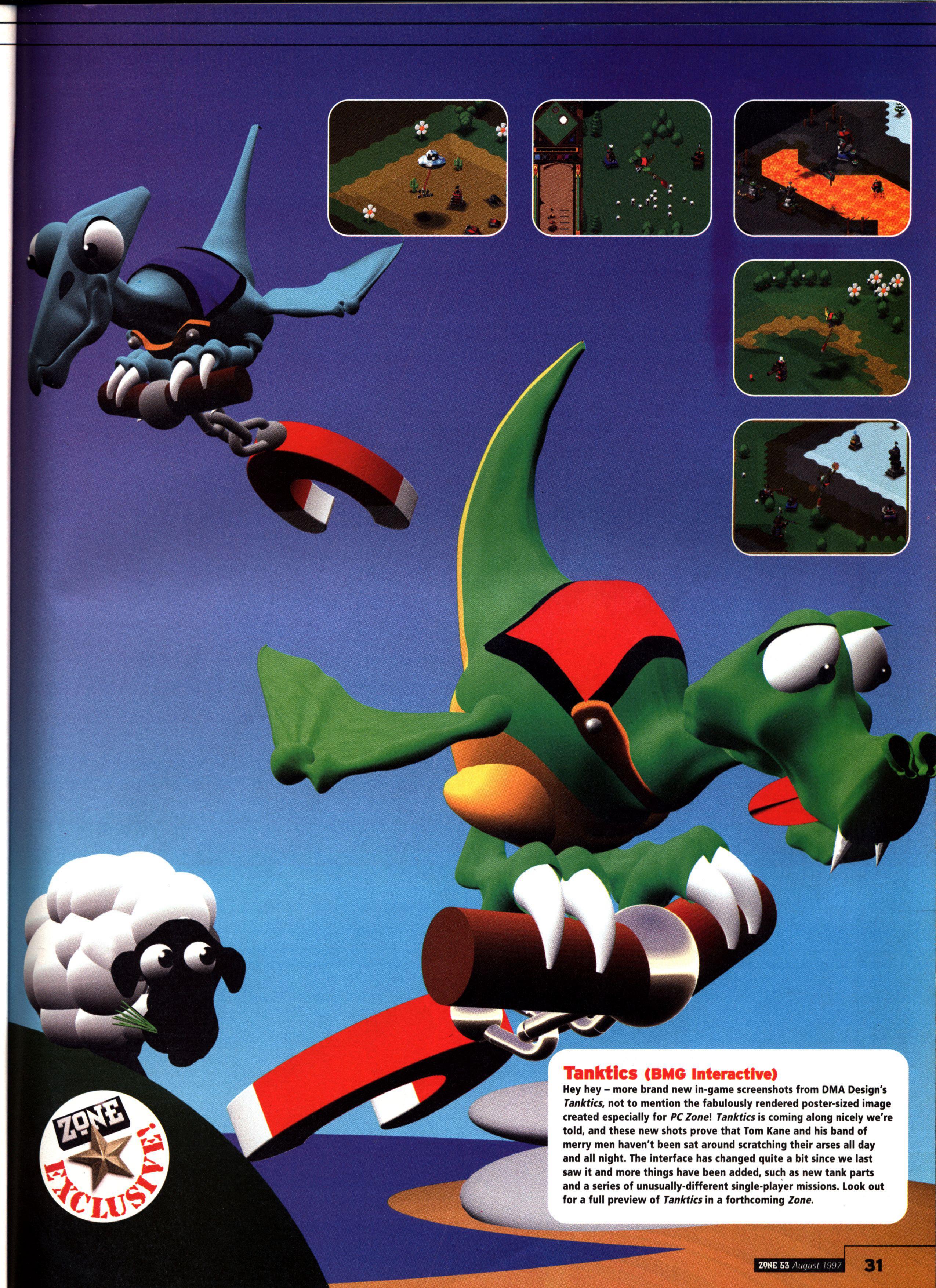 Programmer Craig Stewart cites a more recent inspiration: "Being the first of the RTS games to make it big, obviously C&C did catch our interest. But there are so many clones of that genre out there, we didn't go down that road. Tanktics is fresh, it's like no RTS ever played before. We think people are bored with the C&C clones, and we've done something just that little bit different and, dare I say it, original. There is nothing out there like it. And unless someone clones DMA there never will be, because only DMA could have produced this game. I think they put mindexpanding drugs in our coffee." Brian Baglow, head of Propaganda & Indoctrination, appears to ratify this, claiming that the game is inspired by "Vic & Bob's Novelty Island, a wet Wednesday evening in Lewis, and a plate spinner in Trafalgar Square".