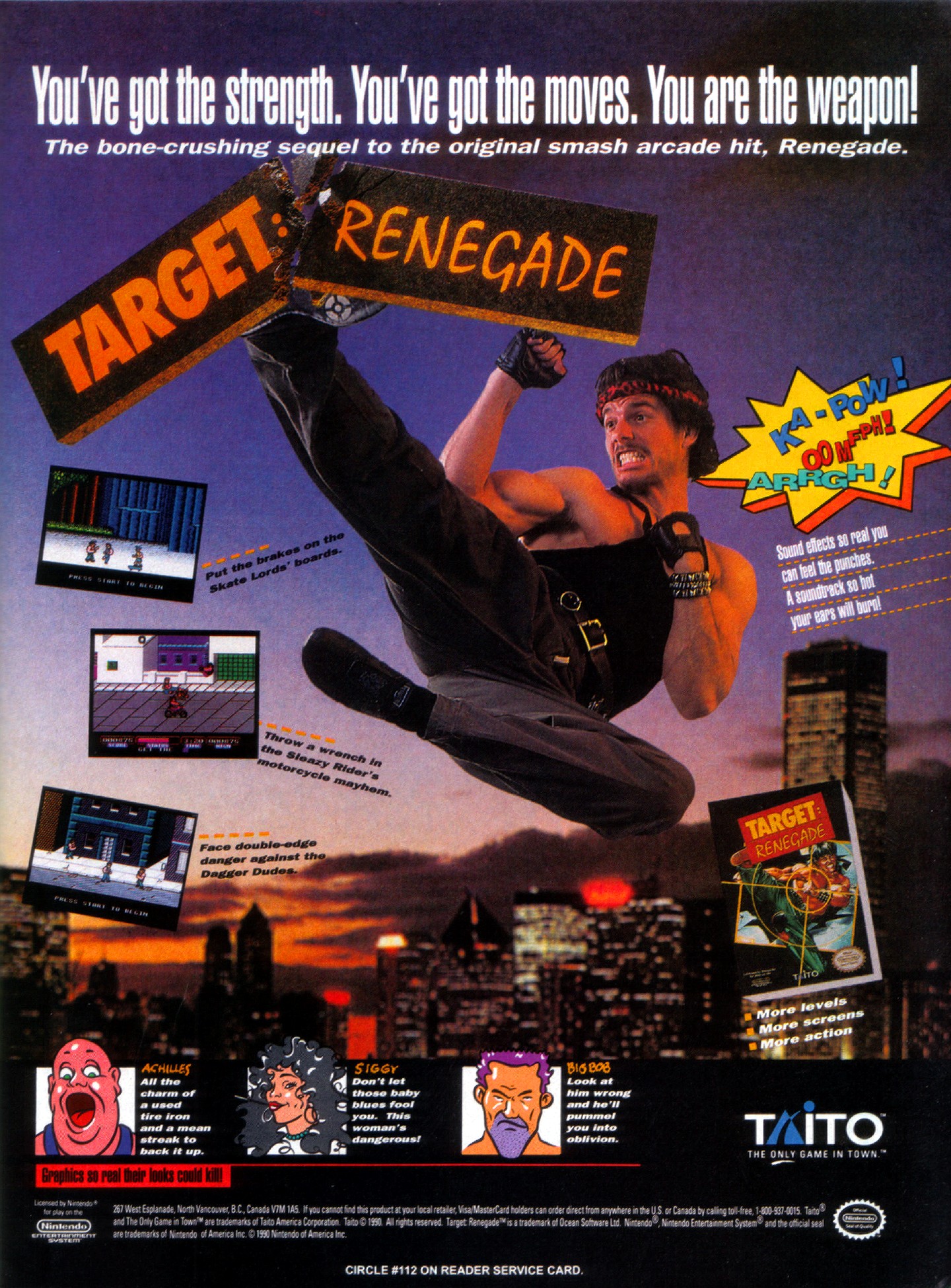 Target: Renegade could have been a blow-out sequel that surpasses even Double Dragon. There are lots of new moves and the graphics are a world better than the original. The game play falls flat, however, and falls prey to incredibly bad flicker.