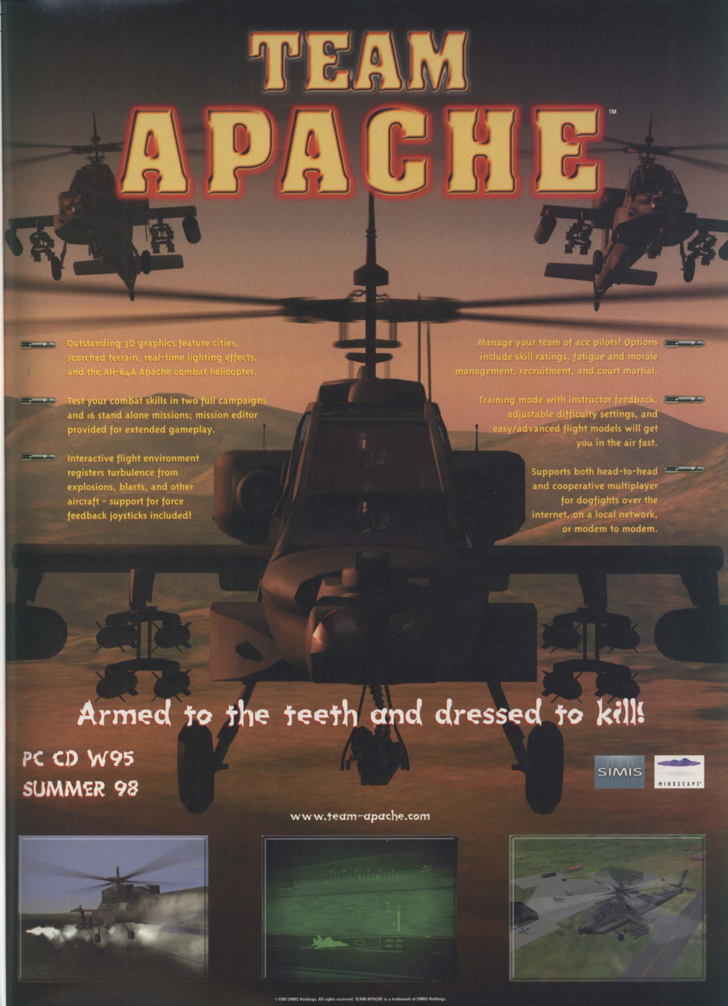 If Mark Hannis Is Reading These Words, let me tell you that you're a son of a bitch. About five years ago I lent him a copy of a rather smart flight sim called AT AC and I've never seen it since. I've barely seen Mark since either, so I can only assume that the two of them are very happy together somewhere, living a life of luxury at my expense. Anyhow, I mention it only because I'm reminded of the old MicroProse title as I sit watching one of the chaps from Simis take me through a demo of Team Apache, the latest entry into the once barren but now thriving helicopter simulation genre. That and because I enjoy settling old scores in public.