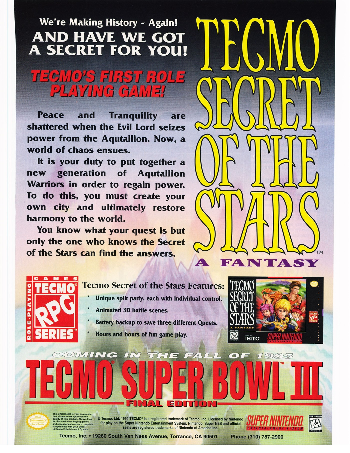 Tecmo Super Bowl 3 is the final Tecmo football simulation licensed by both the NFL and the Players group released on the Super Nintendo Entertainment System. Features real NFLP players and photos, the real NFL schedule, and weekly standings. You can change defensive and offensive formations, fake punts and field goals, create your own Pro Bowl, call audibles and go for the two point conversion.
