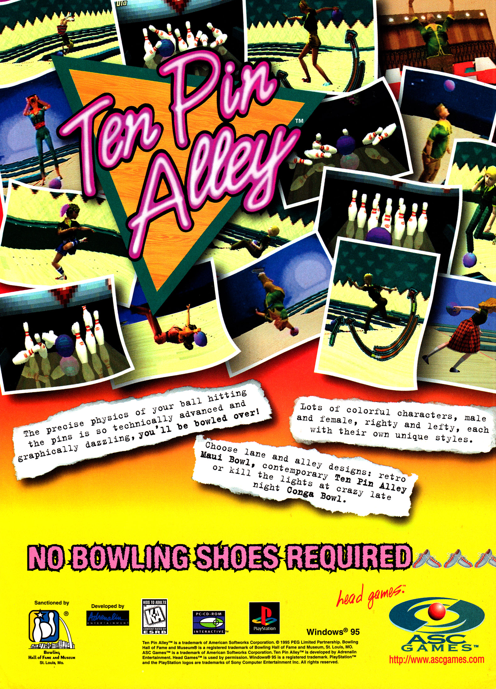 American Softworks Corporation is planning to bring bowling action to the PC and the PlayStation with this fall's release of Ten Pin Alley. Developed with the cooperation of the Bowling Hall of Fame and Museum, this game gives players the opportunity to bowl in different eras, including the '50s, the '90s and even the lanes of the future, complete with new rules and scoring. ASC is looking to re-create the experience of bowling as accurately as possible, with realistic sound effects, precise ball and pin physics and true-to-life lane conditions that affect the behavior of the ball.