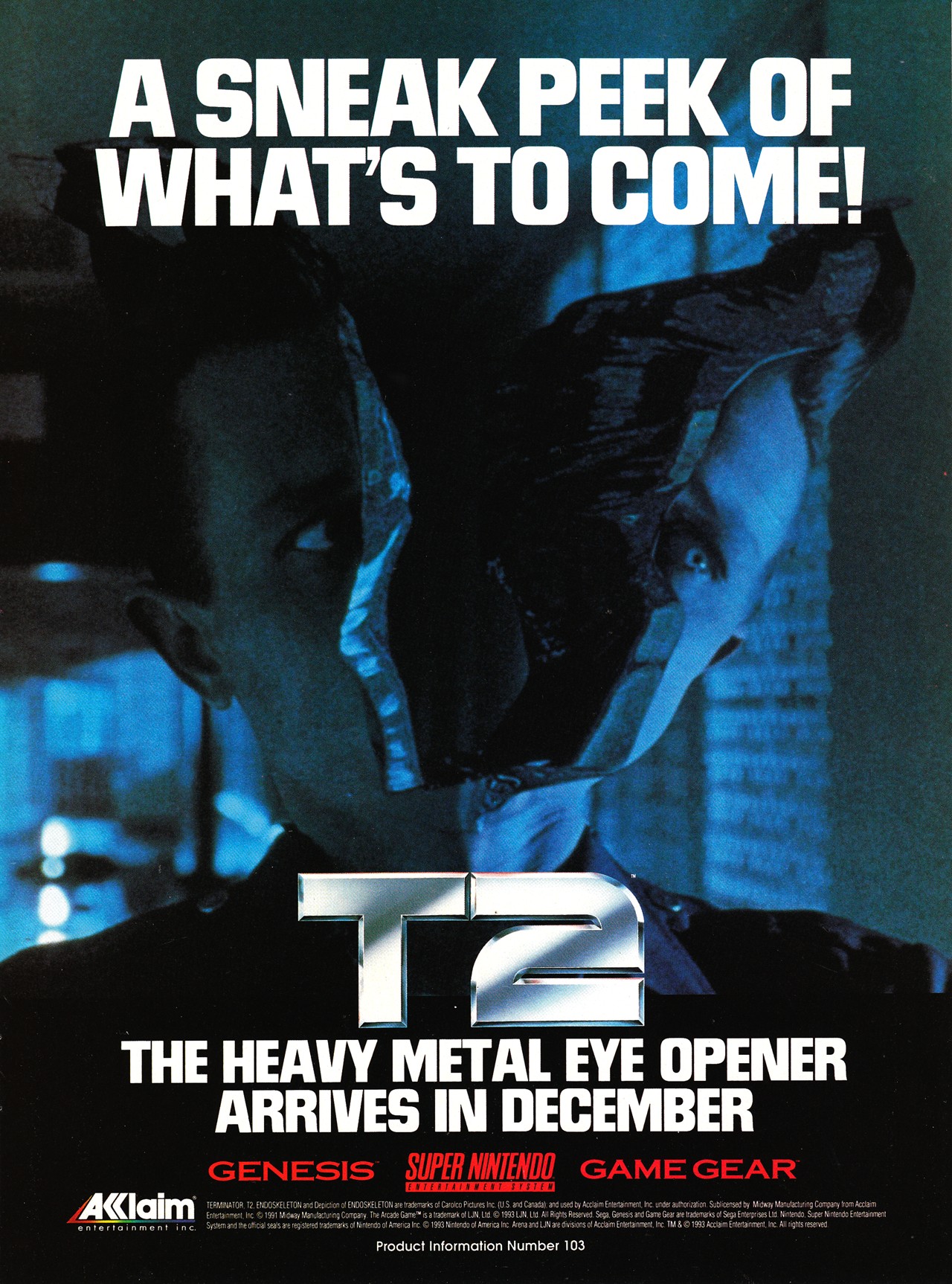 Since Acclaim and its various subsidiaries have first-video-game-conversion dibs on all Midway arcade games, it was only a matter of time before Ah-nuld did his deed to the Super NES. Like the Genesis Menacer version, SNES T2: The Arcade Game, will enable two players to shoot simultaneously with Super Scopes and/or control pads. Mouse owners can use their rodents, too.