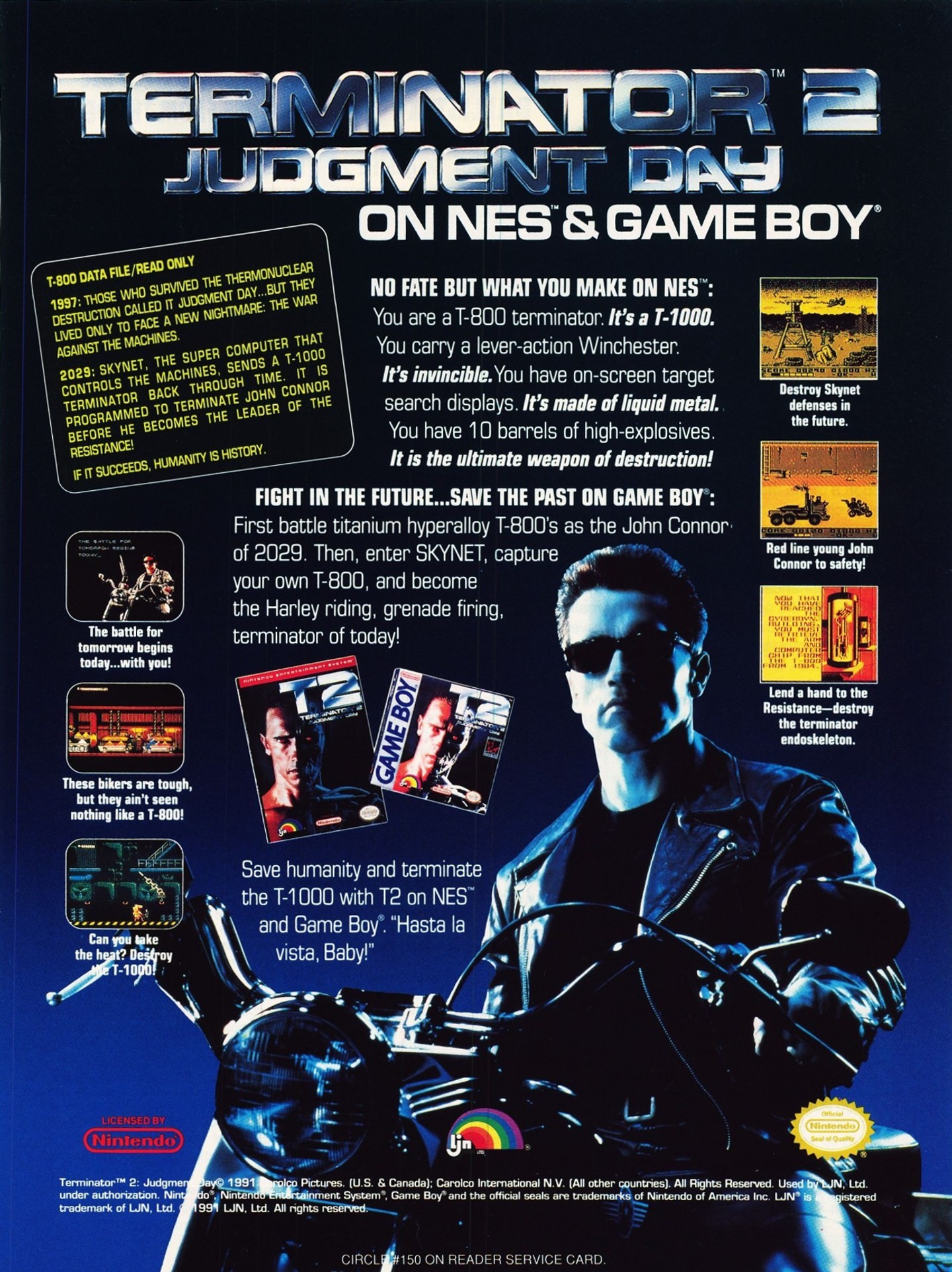 In "The Terminator" he said, "I'll be back!"-he is, in the Game Boy. Arnold Schwarzenegger keeps his promise in UN's Terminator 2: Judgment Day, where the big screen meets the little screen with a bang!