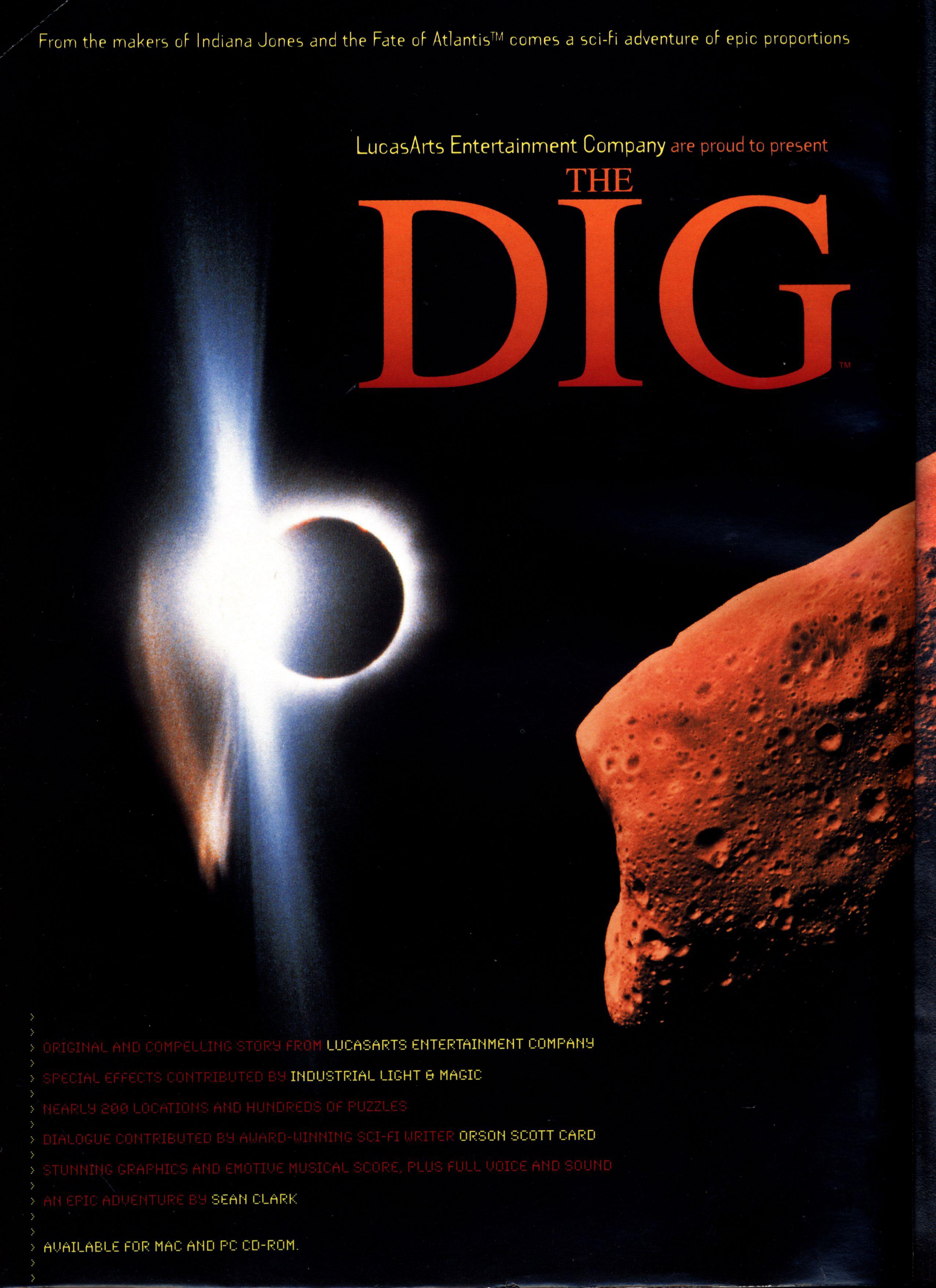 The Dig--"based on a concept by Steven Spielberg", as the hype puts it--puts you in the not inconsiderable moonboots of NASA veteran Boston Low (a breathtakingly stupid name) who must land a team of geologists on a rogue asteroid that's been nuked to a standstill in space, thereby halting its passage towards Earth. Our boy Boston, in the company of geologist Ludger Brink (boy, these guys could kick ass at the Stupid-Name Olympics) and journo Maggie Robbins, then proceeds to examine the Asteroid and the three of them are cast into an adventure that takes them (and you) to the nethermost outskirts of the universe, to a hostile and desolate planet. Your task is to make sure that you and your companions can somehow get home safely.To do that, you're going to have to solve dozens upon dozens of puzzles and visit in excess of 200 locations and try to uncover the fate of the planets previous occupants, a highly advanced civilization that's simply disappeared.