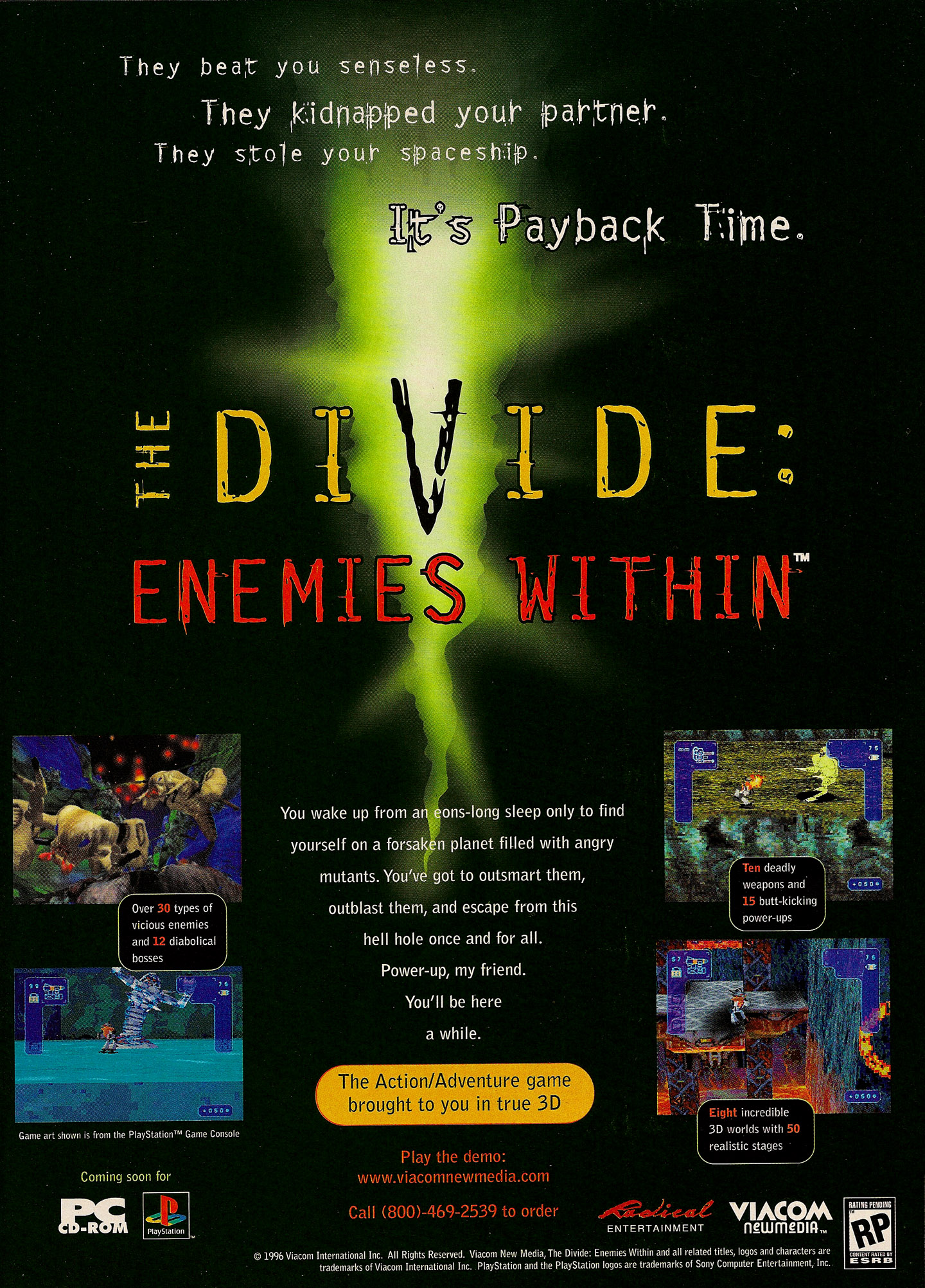 With a grandiose story line that's worthy of a Hugo award, The Divide: Enemies Within prepares to take on PlayStation powerhouse action games like Spider and Pandemonium!. The difference, however, is that this new sci-fi platform game is fully 3-D with complete freedom of movement.