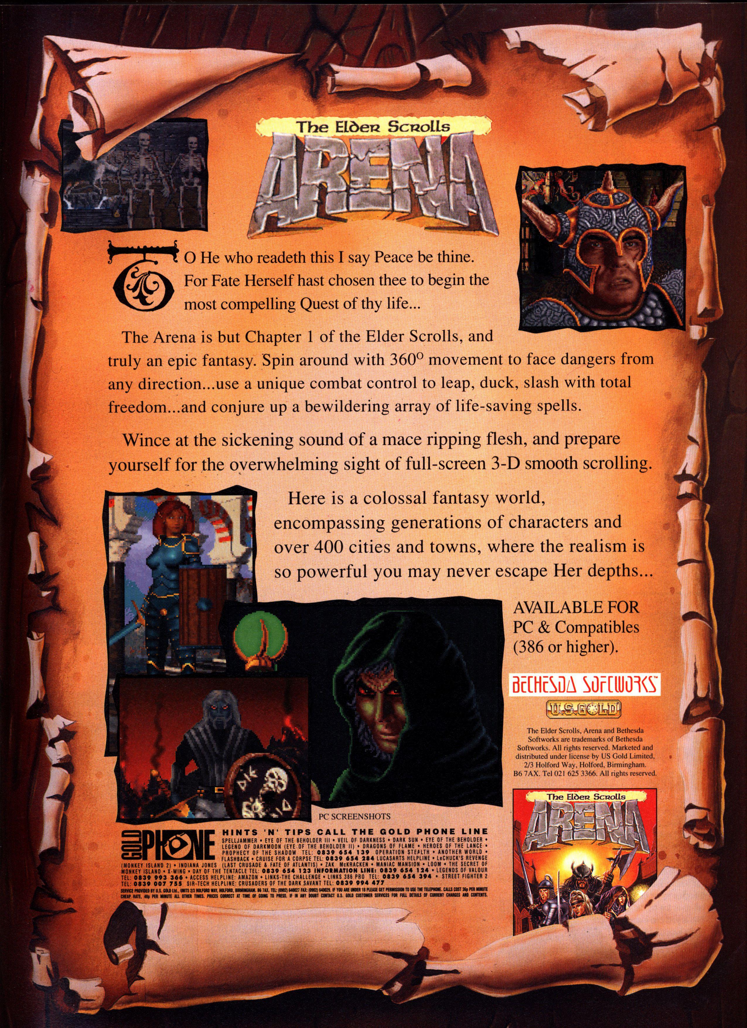Arena: The Elder Scrolls is the latest object of our excitement. Programmed by Beth-esda (Terminator 2029, Terminator Rampage), its what youd call a cross-dimensional, inter-continental, bitmapped-wrapped, full-scale, prime class RPG-athon.