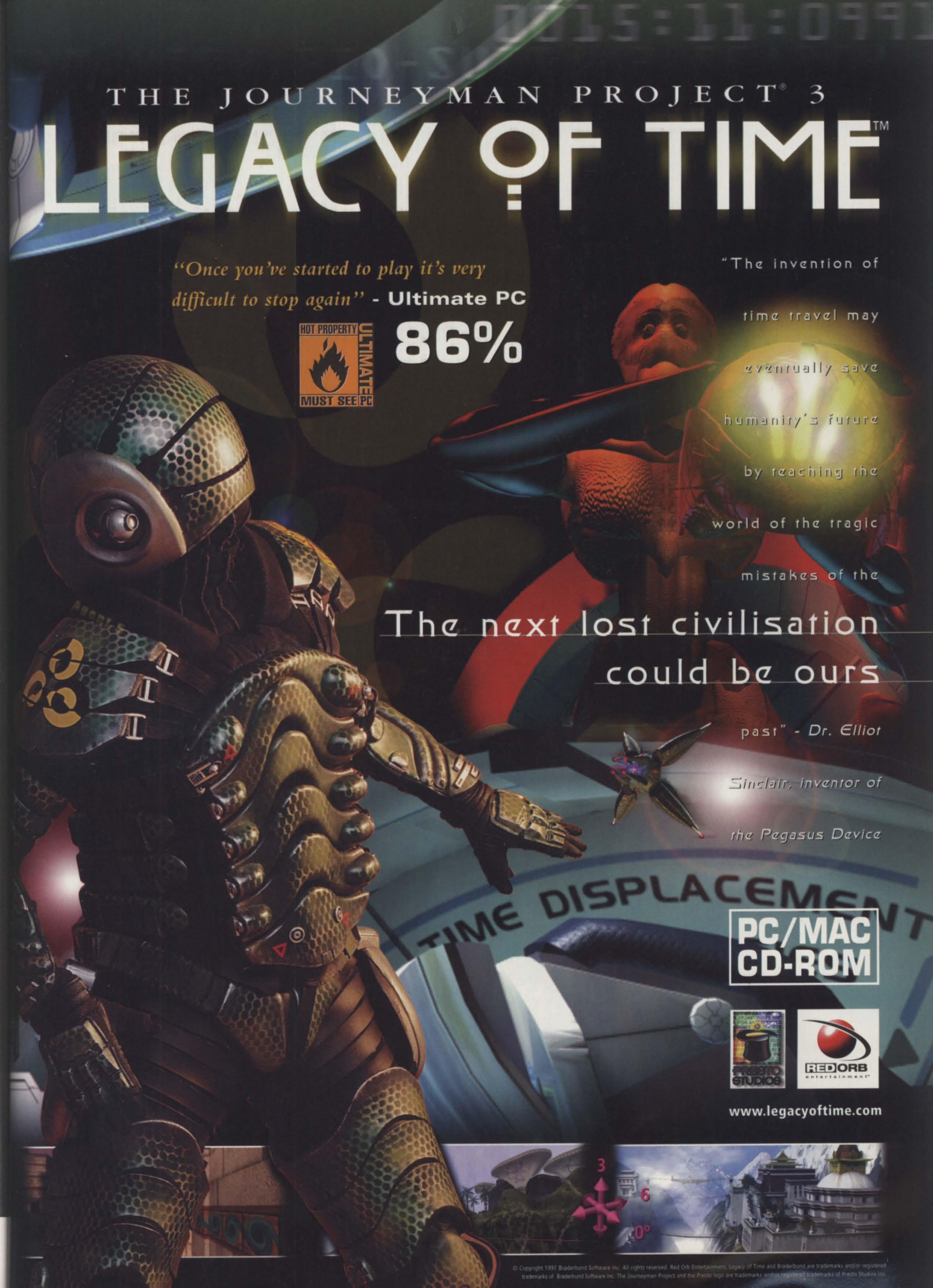 Unlike in Riven, where there is almost no human interaction, in _Legacy of Time- you find yourself constantly chatting with a wide variety of characters to uncover information needed to succeed. The distinctive and sometimes quirky personalities encountered add a lot of spice and excitement to the game, along with your ability through a chameleon suit to assume different identities. While the acting is consistently overdone, as is common in computer games, this component of the game is integrated nicely into the game and is a real plus. Interacting with Arthur can be a real kick, as he consistently provides a touch of humor, and the game options allow you to render him silent if you find his mode of communication to be too annoying.