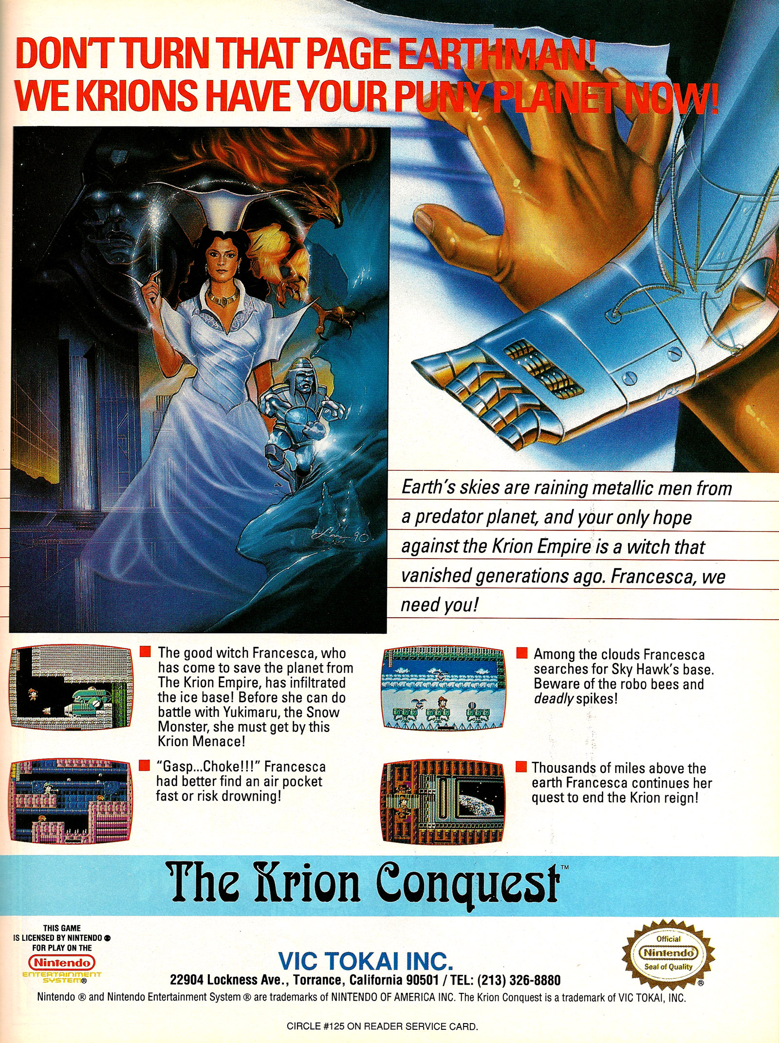 In this MegaMan clone from Vic Tokai, the Krion Empire has attacked Earth. Only the right combination of speed, cunning, and power can stop the numerous Krion armies! Krion Conquest adds a couple of new twists to an old theme.