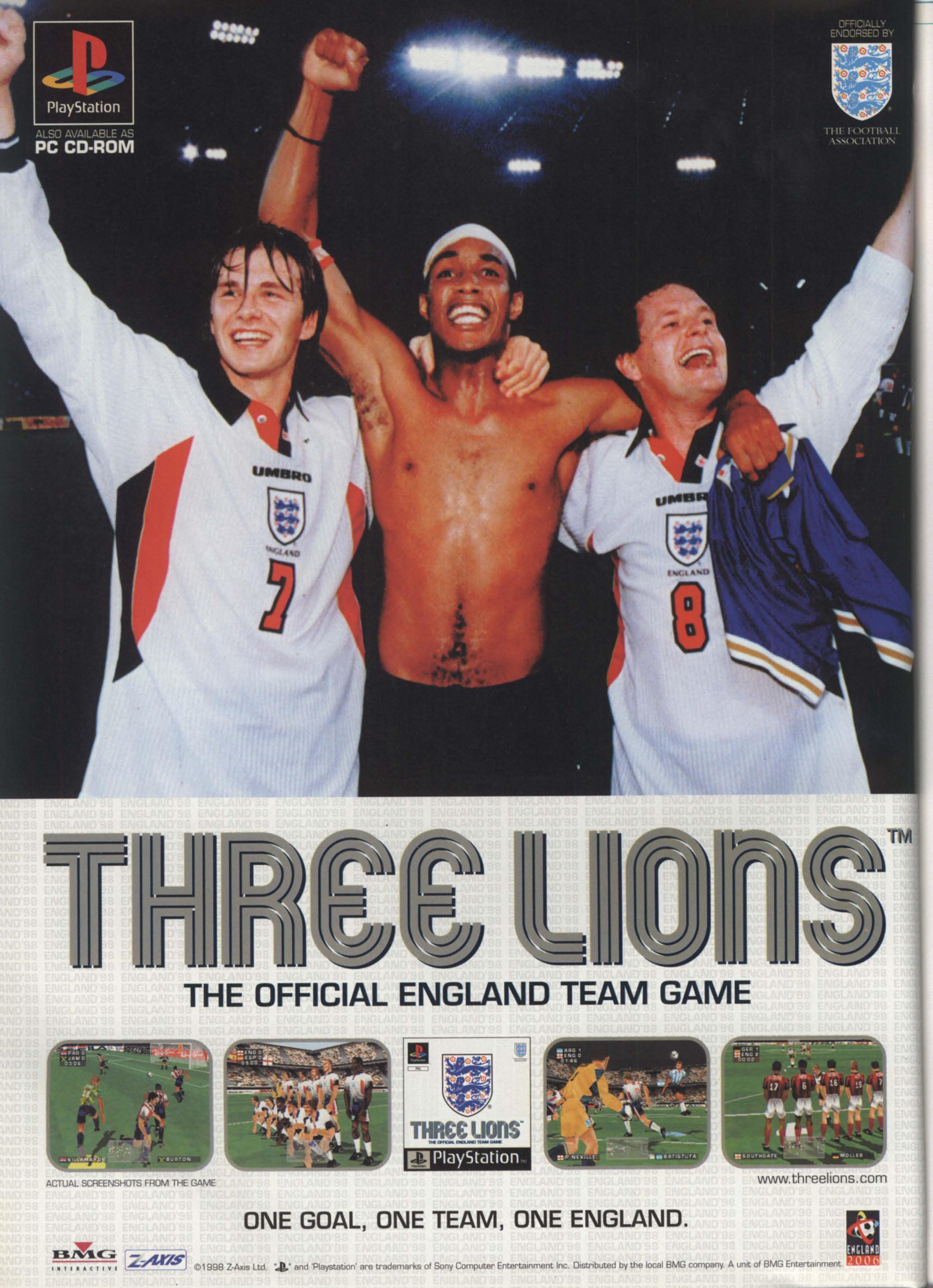 Officially endorsed by the Football Association, Three Lions is the Official England Team Game. It's also officially shit, a fact that no amount of official endorsement can disguise. A more obvious endorsement would have been that of the 'Three Lions' song, but apparently Take 2 failed to acquire the rights amid rumours (subsequently denied by the song's publishers) of a demanded $200,000 fee. Not to worry, an obvious replacement was found in the shape of shoe-rockers Ocean Colour Scene. And whatever they were paid, it was clearly too much, the upshot being a short movie of recent England action interspersed with footage of the PlayStation version, all accompanied by OCS's 'Hundred Mile High City'. The point being?