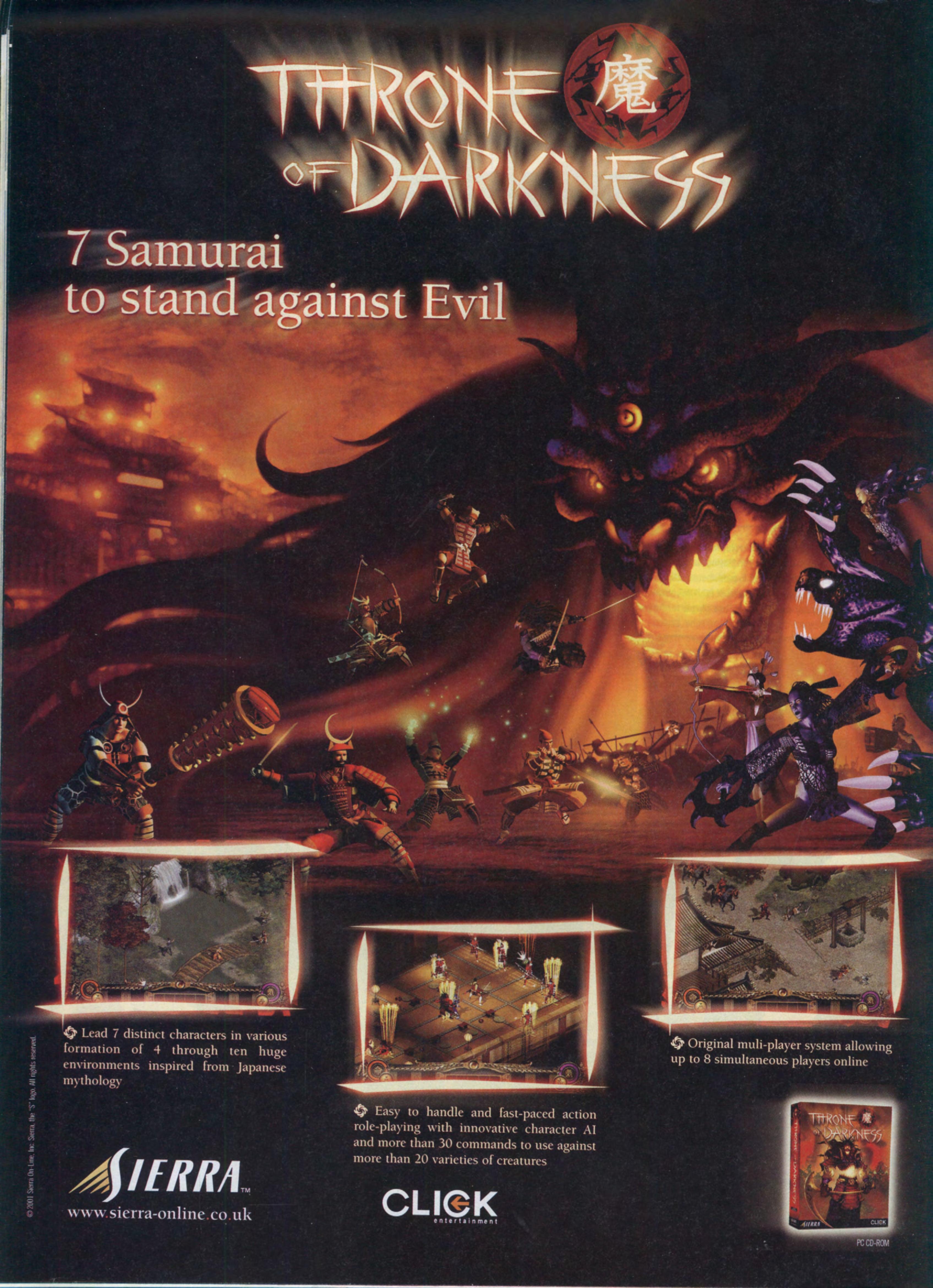 Sierra Studios' Throne Of Darkness, due out in the summer, will be set during Japan's feudal period. Although its name sounds more like the title of a Megadeth B-side than an action RPG, it looks as if it's going to be one to watch. We're being so presumptuous because several members of the ToD development team were involved in producing Diablo, one of the best a ction RPGs of its time, and one that still boasts a massive online gaming community.
