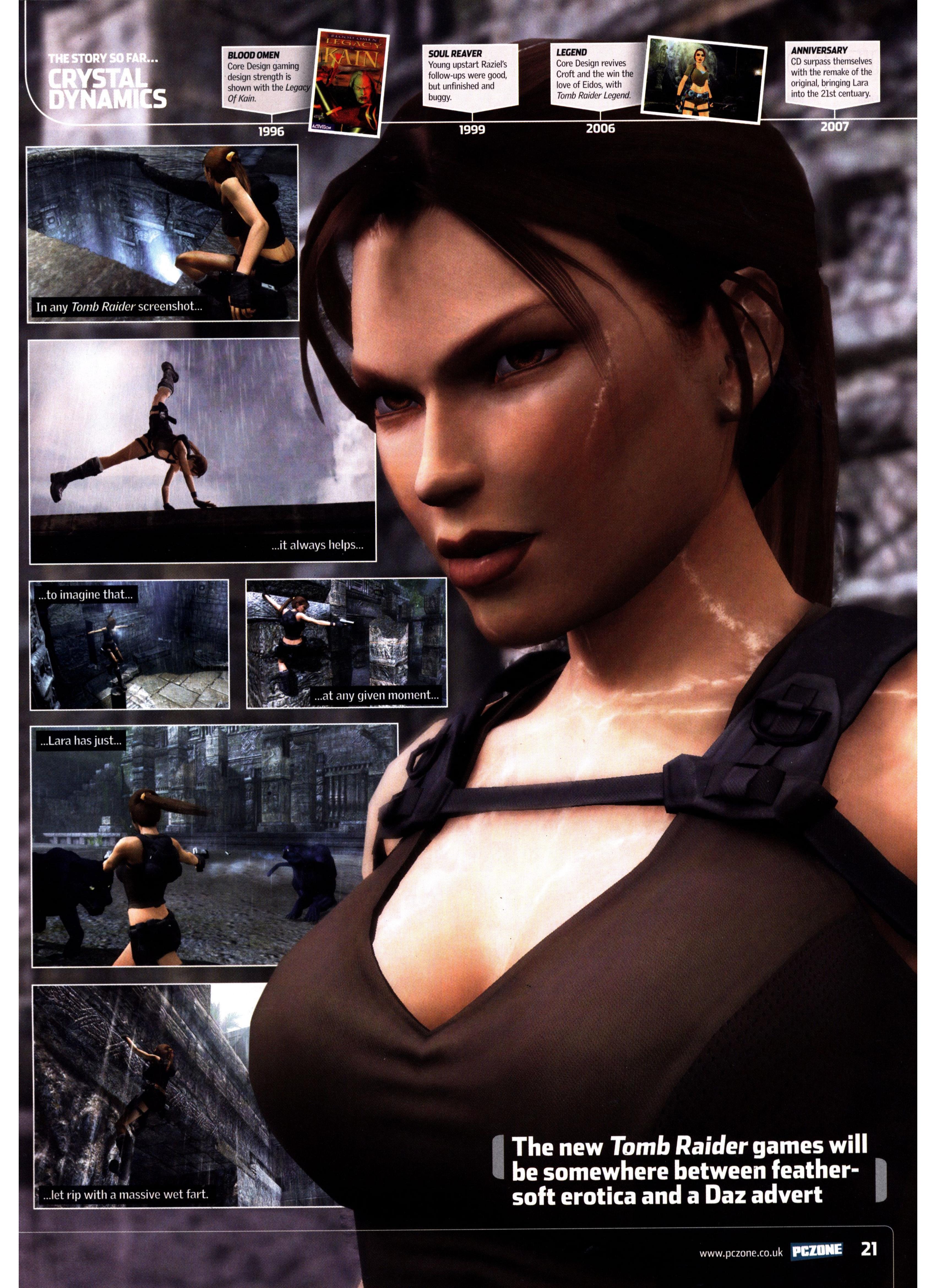 "The Tomb 3 team came together through a mish-mash of other projects. Martin Gibbins, the lead programmer, had been working on Blam! [Machinehead. Then he went on to do some research before coming to this. Chris, the second programmer, is new and he's only been with us for a few months. Everyone came together simply by us sitting down and deciding to do the new game, and then deciding where we were going to take people from. Actually Martin was working on a game for about four months that used a new character, but using the Tomb Raider engine."