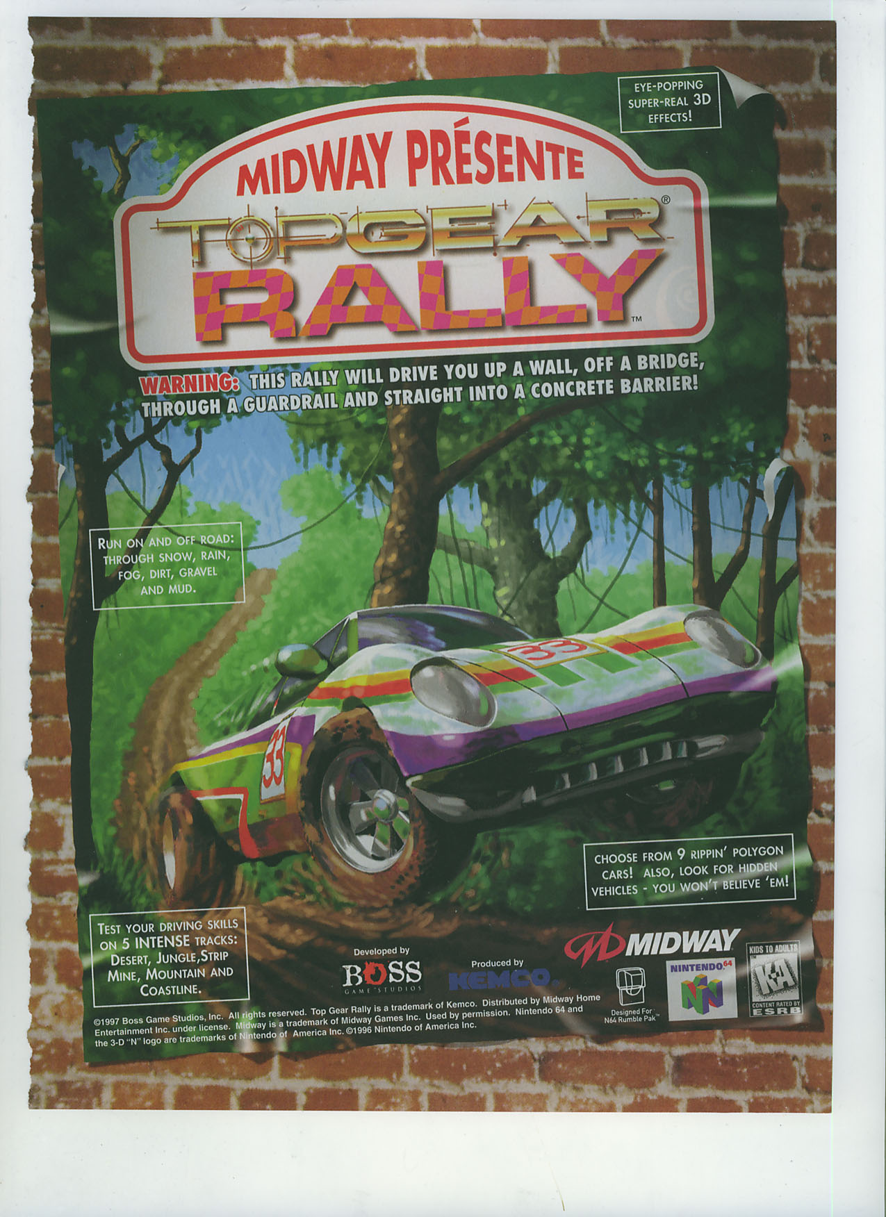 Top Gear Rally is poised to take the Nintendo 64 racing crown. Leagues ahead of the dismal Cruis'n USA, TGR features five different on-road and off-road tracks, including desert, mountain, jungle, and coastline tracks, as well as diverse driving conditions, like snow, fog, rain, and night driving. TGR will also be the first driving game to support the Rumble Pack, so look for added thrills to complement the game.