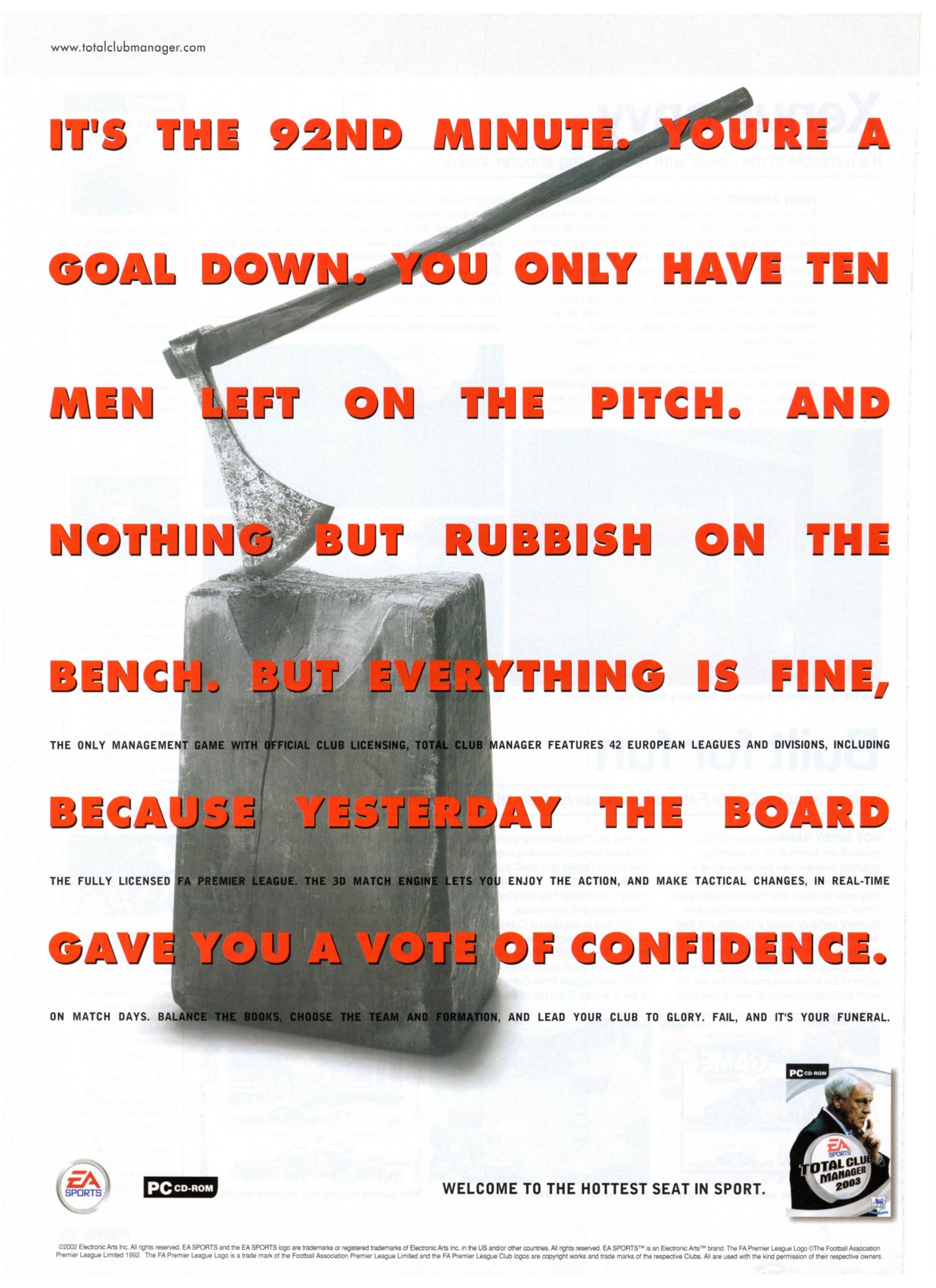 Astonishingly though, it is actually worth the trauma, as beneath the traditional EA Sports gloss lies a game of surprising depth and playability. Developed in Germany by Germans, this is essentially an anglicised version of a game called Fussballmanager 2002, given an EA Sports makeover and with the FIFA 2002 engine bolted on. Some of the surrounding screenshots may show highly detailed 3D action, but your best bet is to pretend that they’re not there, as the game actually works better as a straightforward textbased Champ Man rip-off. Clearly, EA would never have been brave enough to release it as such, but the employment of the FIFA engine simply cheapens the experience, and bears little relation to what is an extremely complex simulation.