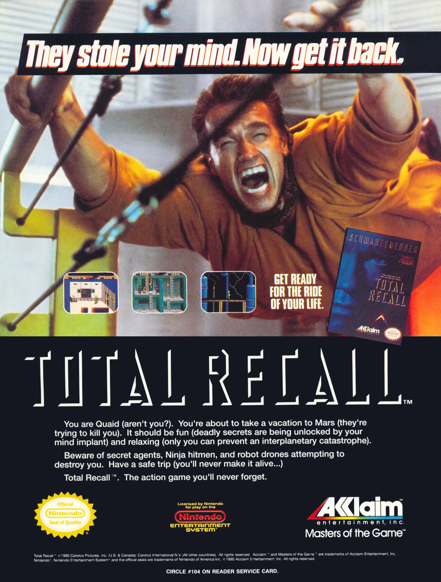 Combine a mega-hit movie with one of the best Nintendo software companies around and one would expect a great NES game. Wrong! Total Recall has substandard graphics, fair gameplay and is just not what one would expect from Acclaim. A big disappointment. Not up to standards.