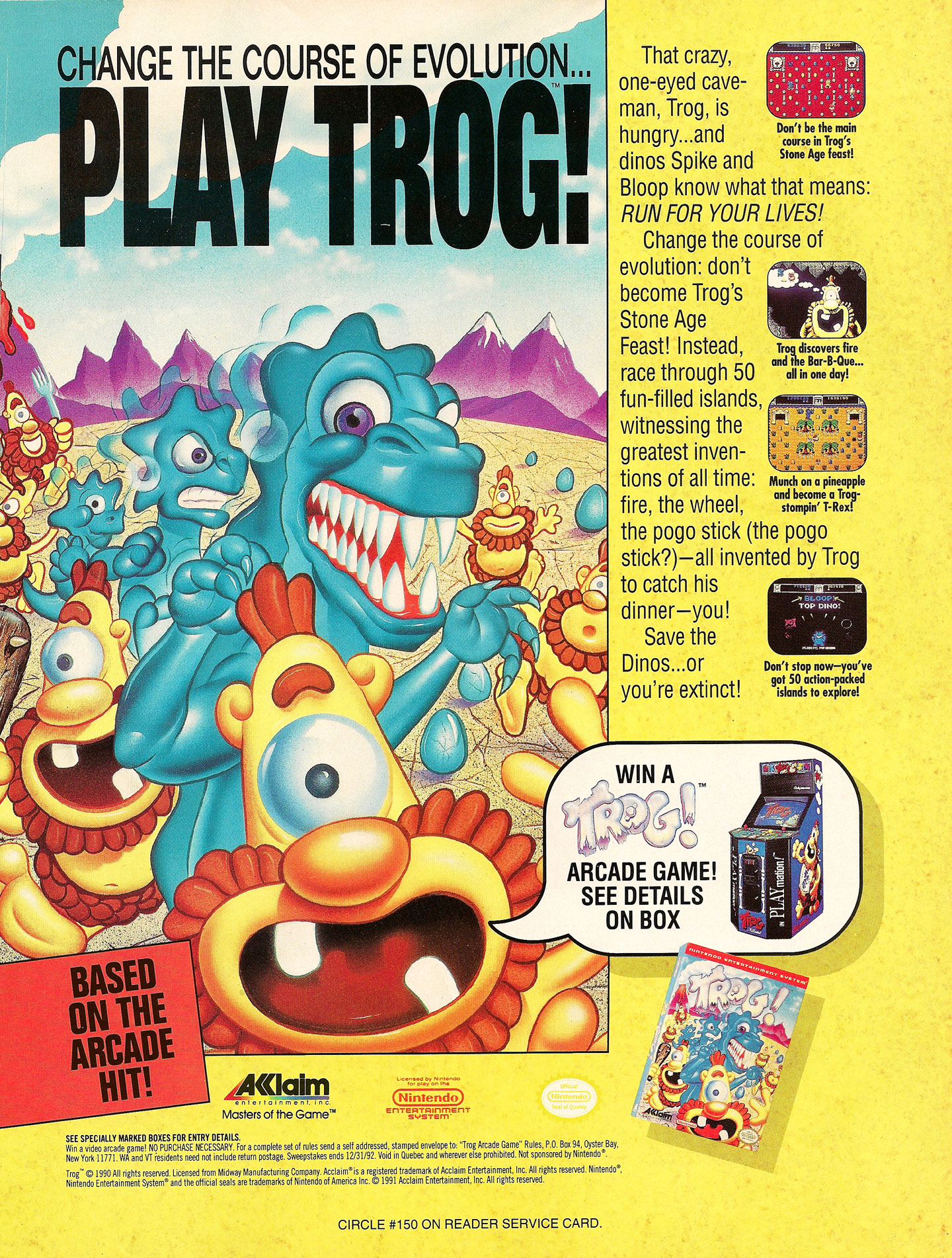 Ever matched your wits against a one-eyed caveman? Chances are you haven't, but, then again, there's a first time for everything. In Acclaim's new two-person, maze-action game, Trog, you play either Spike or Bloop, dinosaurs trying to avoid becoming a steak dinner for the ravenous, meat-hungry caveman, Trog. While Trog chases you across a multitude of islands, you must avoid his snap-happy jaws and collect a variety of colored eggs -- the key to completing the level. And that's just the half of it! As the game progresses Trog discovers the wonders of items such as the wheel and fire, which make him twice as dangerous.