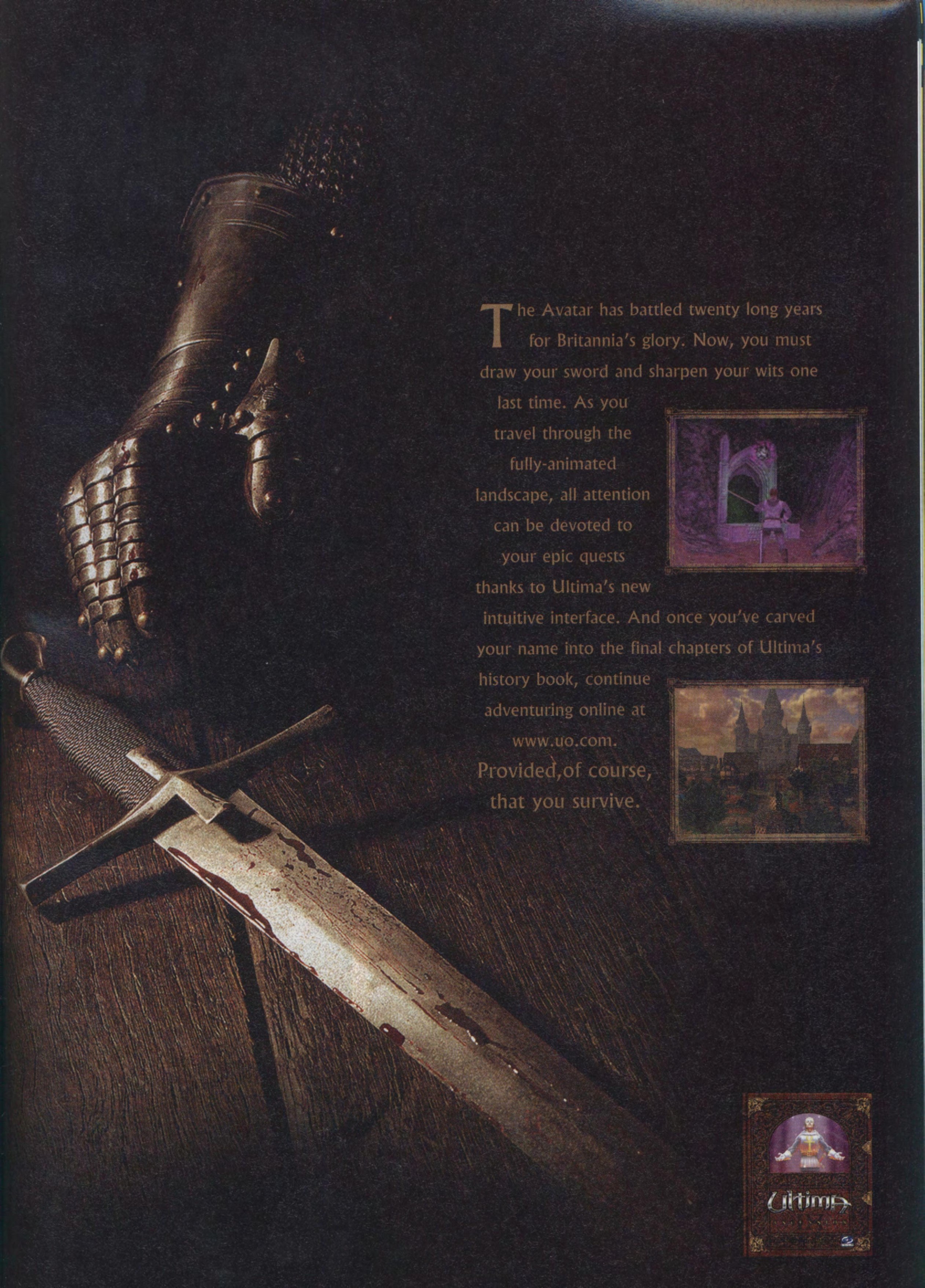 In the words of the Ultima IX website: "Prepare to embark on an adventure beyond imagination with the return of the best selling role-playing series of all time. In the ninth and final chapter in the 20-year legacy you return to Britannia for your last epic quest. As the heroic Avatar, only you can save Lord British and his people from the evil Guardian who has devastated the landscape and tainted the eight sacred virtues. Valiant combat, magical prowess and knowledge of the eight virtues are your weapons against evil in Ultima IX: Ascension, the most epic role-playing game ever created for the PC."