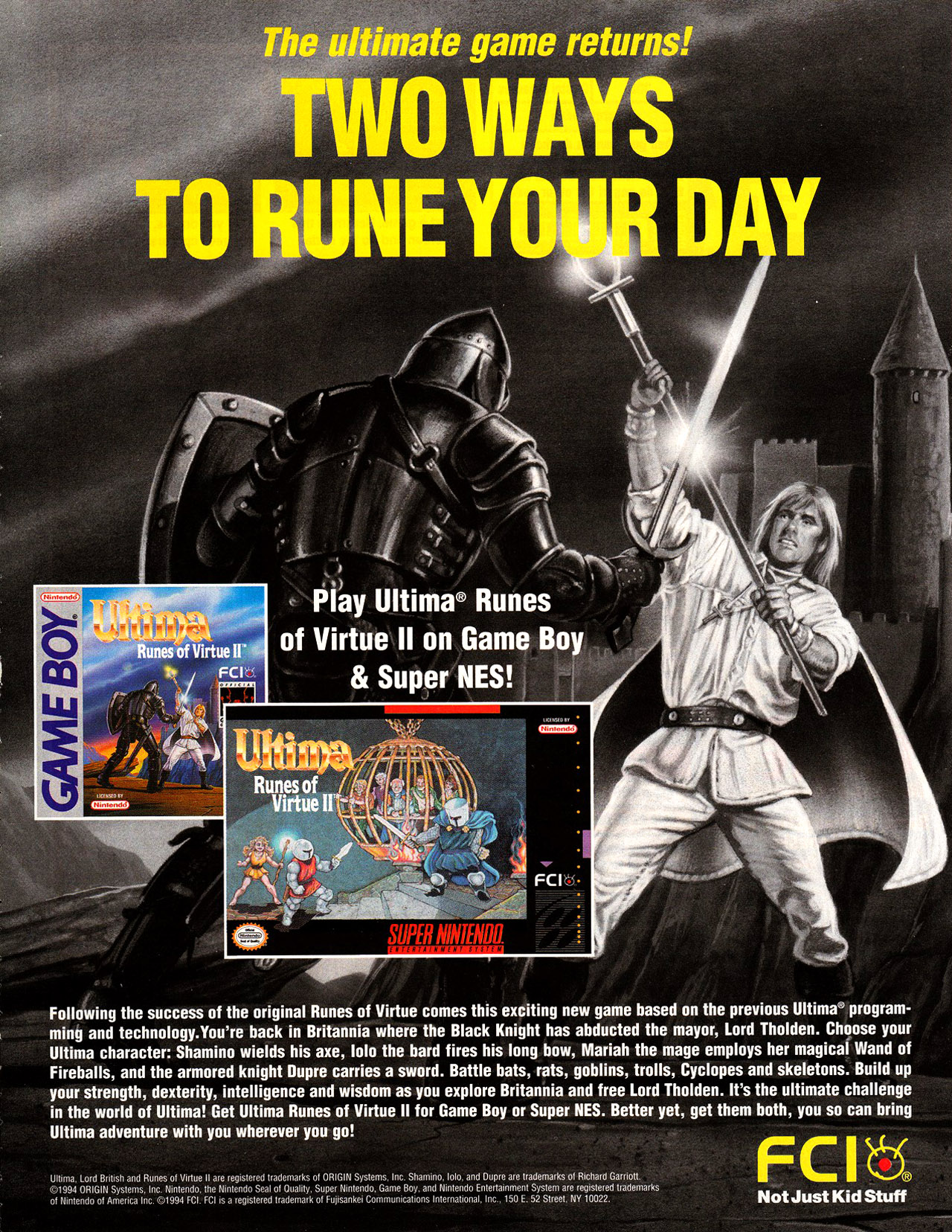 Call it Ultima Lite or Britannia for the Young at Heart. This splendid Super NES translation of Runes of Virtue -- an Ultima previously available only for the Game Boy -- isn't just for the backseat any more.