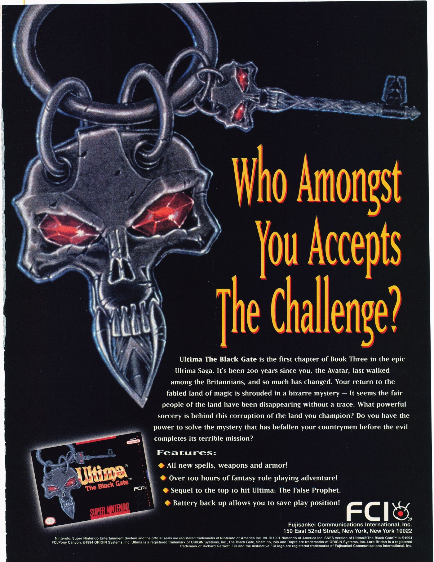 UItima The Black Gate is the first chapter of Book Three in the Ultima Saga. You. the Avatar, receive a message from another dimension. The sender is a being who has enormous power and malicious intent. You arrive at Brittania alter 200 years ol absence and find that everything has changed. Nothing is the same. Innocent Britannians have been disappearing and a cult has formed splitting Britannia into two groups. Does this cult, The Fellowship, have peaceful intentions or are its members conspiring to some dark purpose?