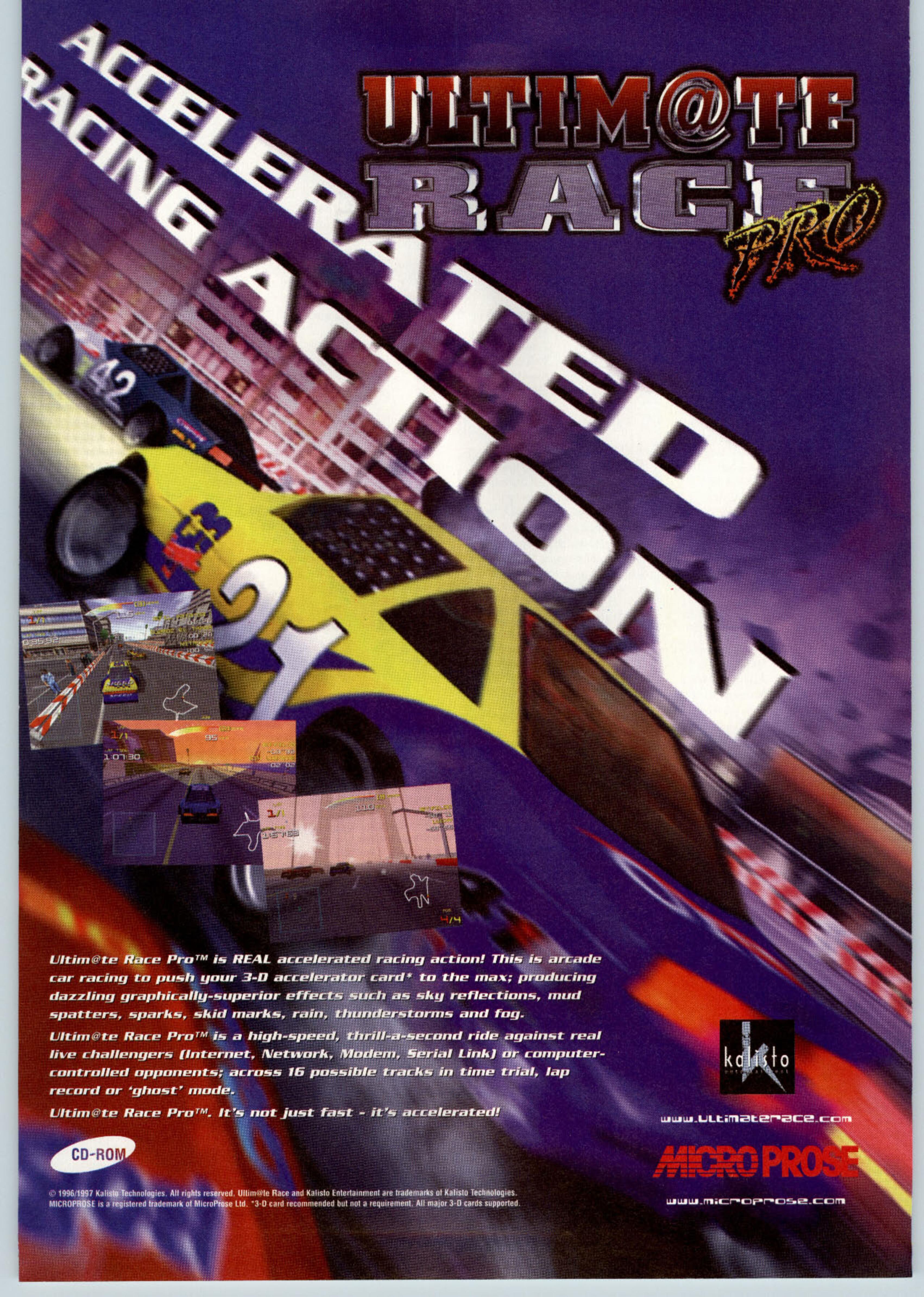 The PC isn't in desperate need for more racing games, but MicroProse's new road burner looks like it's going to be a serious contender. Developed by Kalisto (Nightmare Creatures,Dark Earth), it's clear that Ultimate Race Pro has been built from the ground up with 3D acceleration in mind. Visual effects include smoking skid marks, lens flares, fancy shading, and detailed textures--thin San Francisco Rush on your PC. It's no slouch on gameplay, either--16 players can battle it out over the Internet on 16 tracks, including a destruction derby arena. This could be one to get revved up about.
