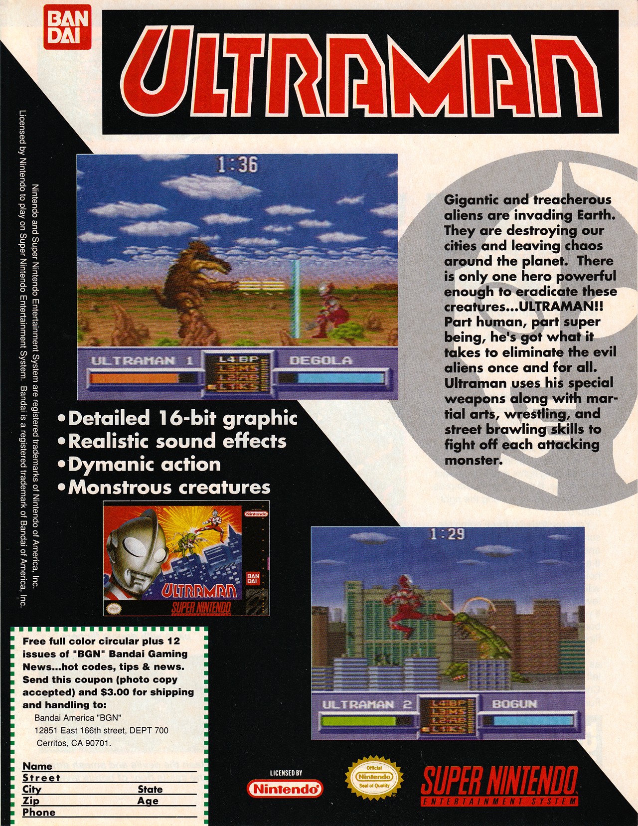 Ultraman is coming to the video game world. This is Bandai's first Super NES title and it looks like it'll be a sleeper hit. You must battle against eight different monsters who are terrorizing the land. You're not just a normal super hero though, you have the ability to increase your size to gigantic proportions. You can use a variety of special attack moves like roundkicks, uppercuts, and jump-kicks as well as defensive moves like back flips and somersaults. To finish off the monsters you must use a special laser technique. Great animation of the huge characters and great sound make this a pleasant cart.