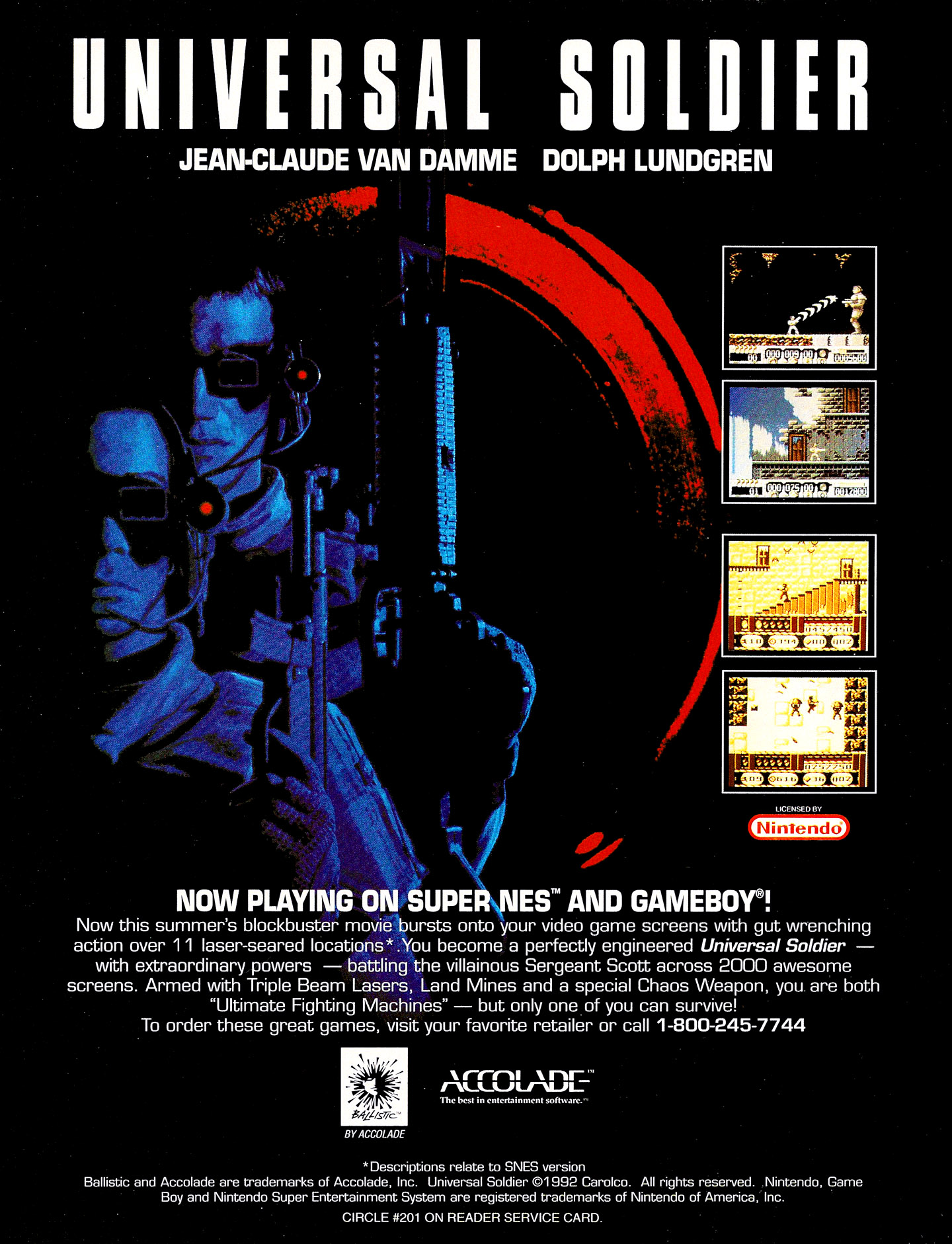 Universal Soldier, now for the Super NES by Accolade's Ballistic publishing division, is very loosely based on Carolco's sci-fi flick of the same name. Don't expect a cohesive story line, cinema intermissions, appearances by actors Jean-Claude Van Damme and Dolph Lundgren, or any of that jazz. Instead, the game targets action enthusiasts with solid, side-view, run-'n'-gun gaming, but this commando has a few holes in its camouflage.