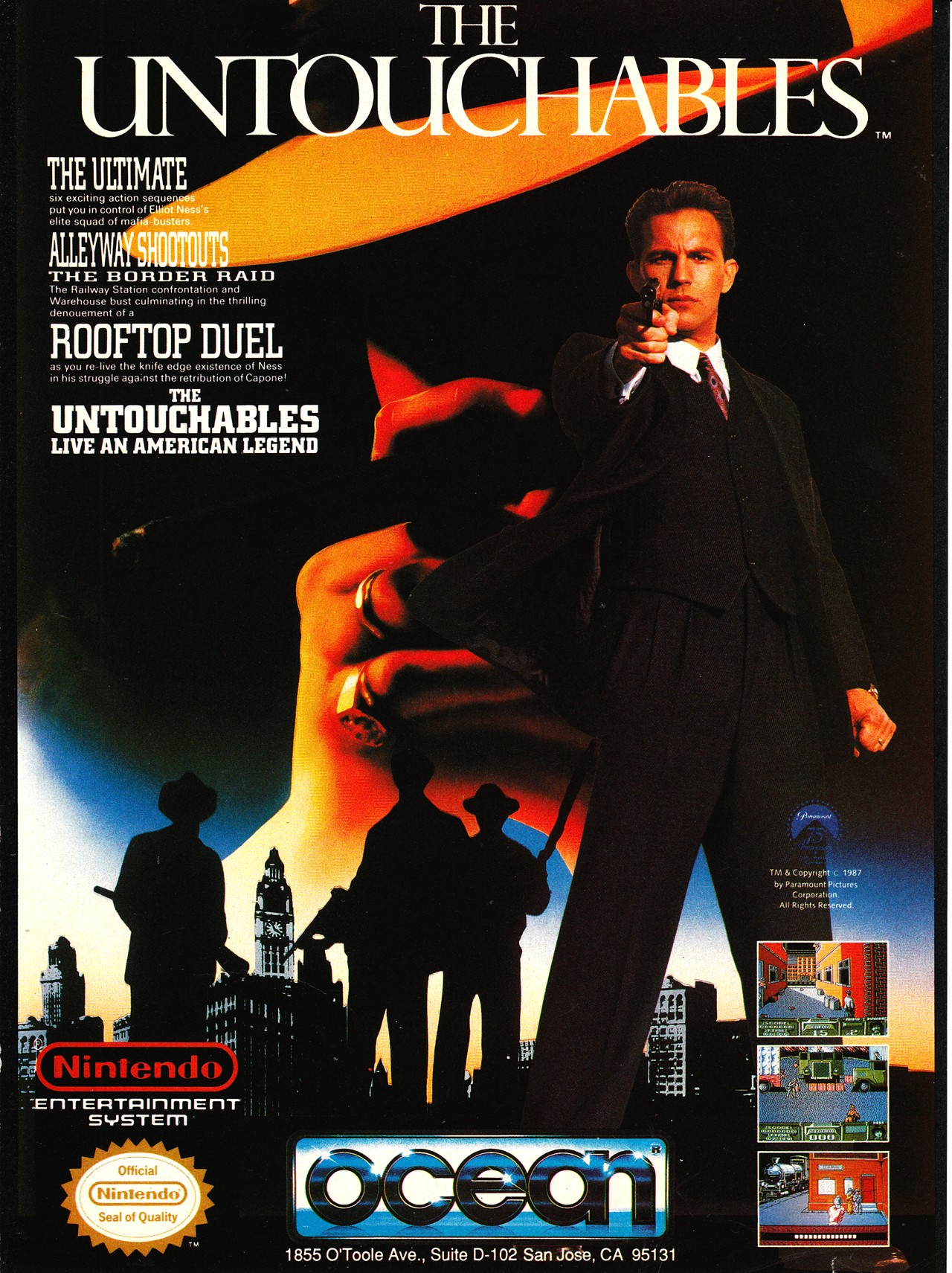 The Untouchables is a side-scrolling video game that was released in 1991 by Ocean for both the Nintendo Entertainment System and Super NES game consoles. The game is based on the movie of the same name starring Kevin Costner. It lets you play out some of the most interesting and significant parts. It is set in Chicago and the main goal of the game is to take down Al Capone's henchmen and get Capone in jail as well.