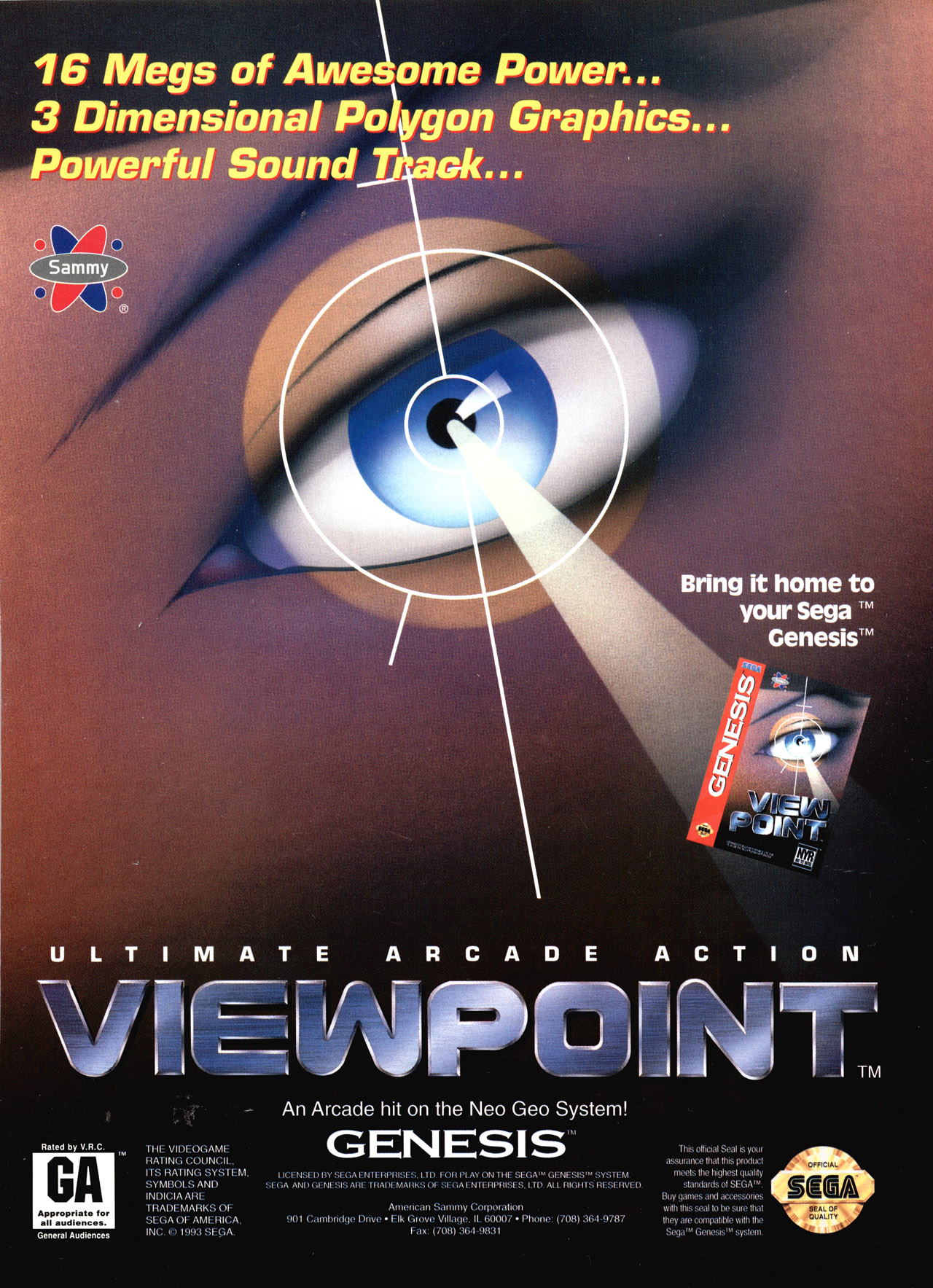 While I like the graphic changes over the Neo, the new music just doesn't sound right. Viewpoint uses some original concepts, and the perspective is pretty cool. I have played the Neo-Geo version, so I'm used to the speed. Newcomers might find it a tad slow. If you want a tough shooter, you won't be disappointed with this one. It's hard...unbelievably hard. The password system is nice, but I would have settled for a more lenient "Easy" Mode.