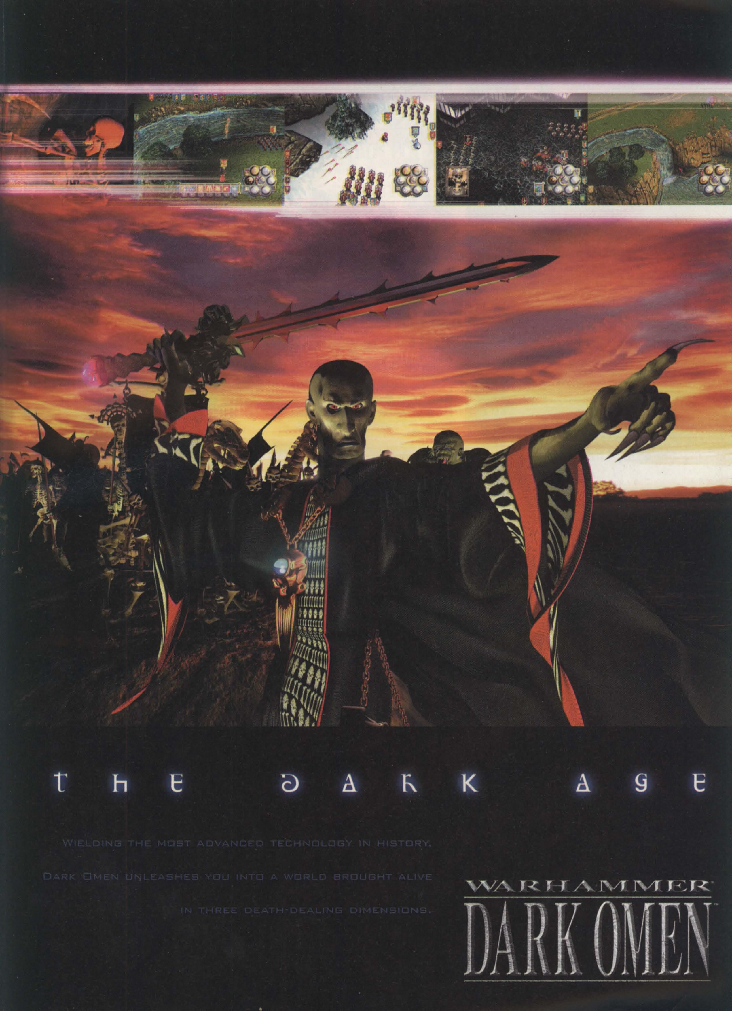 Dark Omen is a real-time 3D-battle game based on Warhammer, the world's best known fantasy battle system, by Games Workshop. The battles are depicted in a true real-time 3D environment with freedom to move, rotate and zoom the viewpoint as desired. Command regiments of cavalry, infantry and archers as well as wizards, war machines and huge monsters challenge you in your role as a mercenary army captain, tasked with wiping the hordes of darkness from the face of the map.