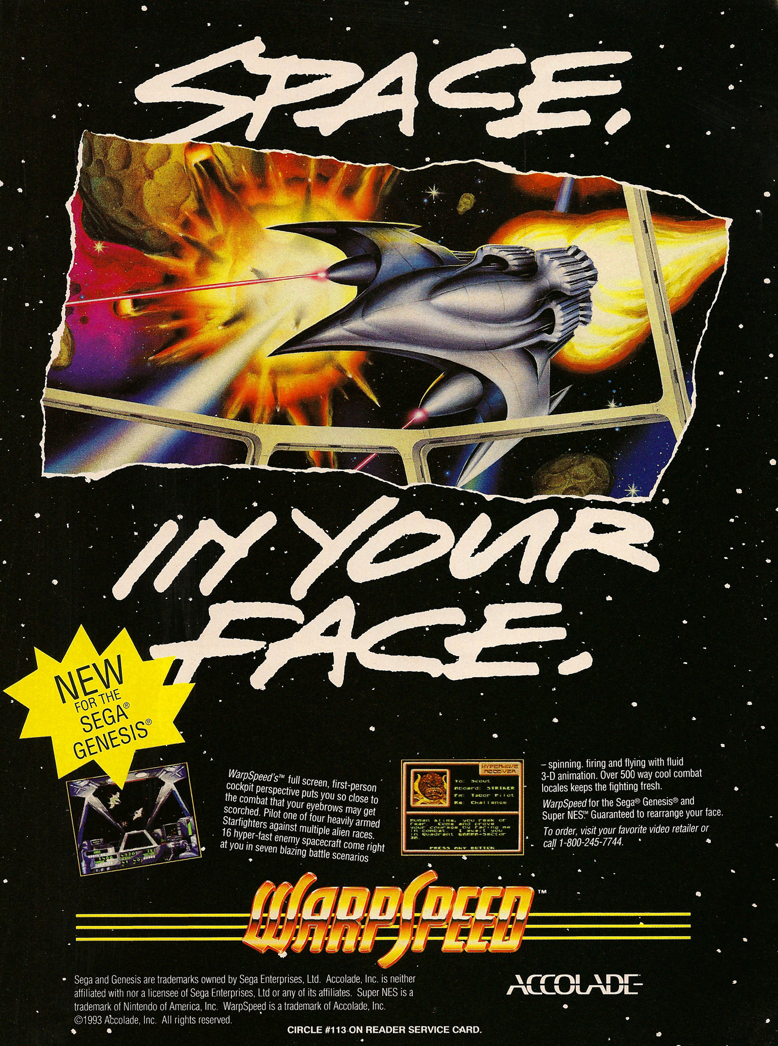 Defend the Earth in the first Starfighter capable of tackling entire squadrons of enemy ships (which come in 16 varieties). At the press of a button, you rush through space until a blinding flash marks your cross into WarpSpeed. With loops, turns, and spins, the 3D spaceships in this seven-mission game push the Genesis's rotation and scaling graphics capabilities to the max. Successfully complete all missions, and you'll get to fly higher powered ships.