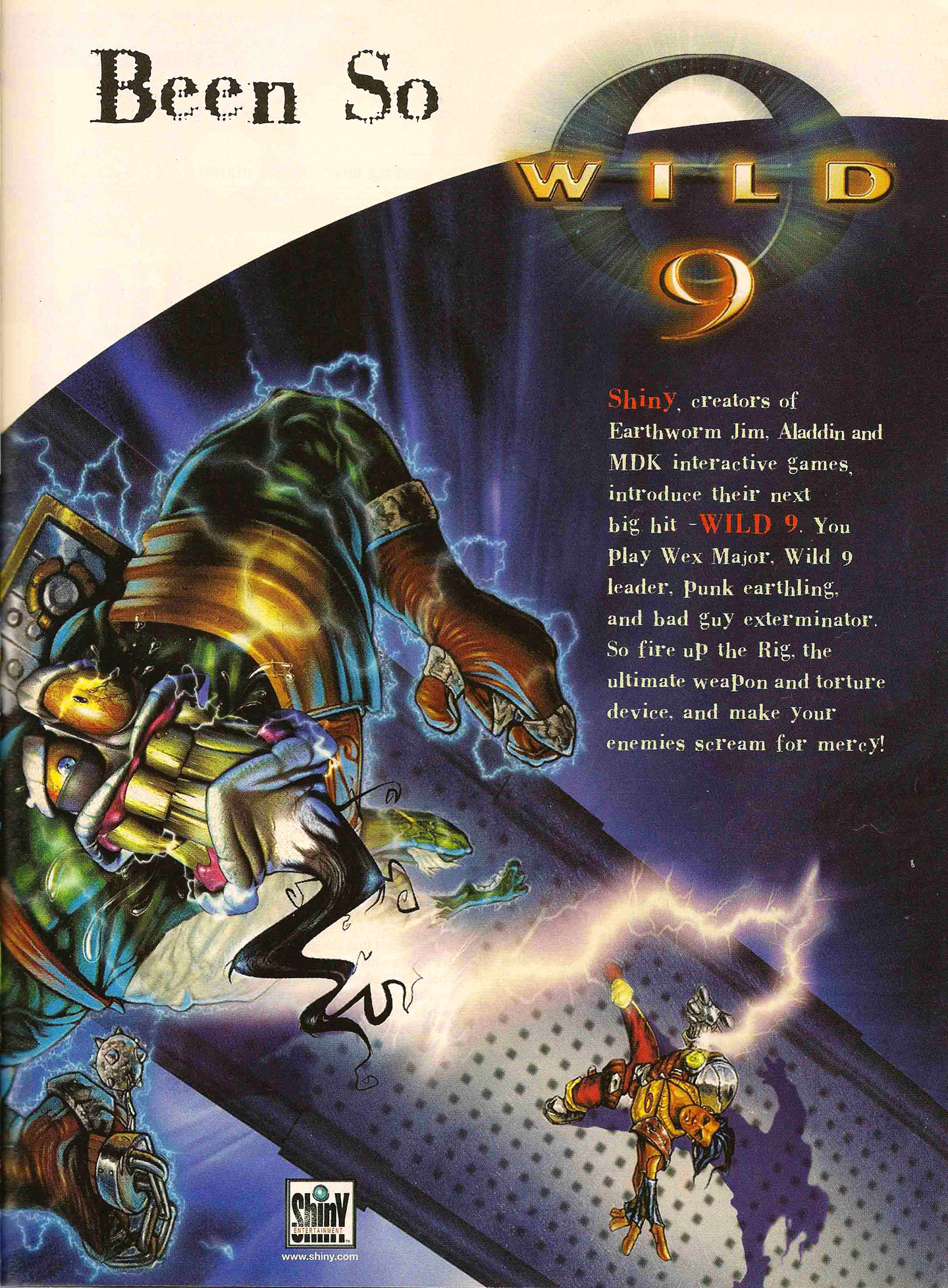 Wild 9s is the latest game from Shiny Entertainment, the same folks who gave us Earthworm Jim and MDK. At this point there's more story than game. The tale centers on Wex, who leads eight other characters as they fight the evil forces of Karn, a monster who's systematically destroying the galaxy. Wild 9s will feature platform-style action in 3D environments (much like Pandemonium) and huge monsters.