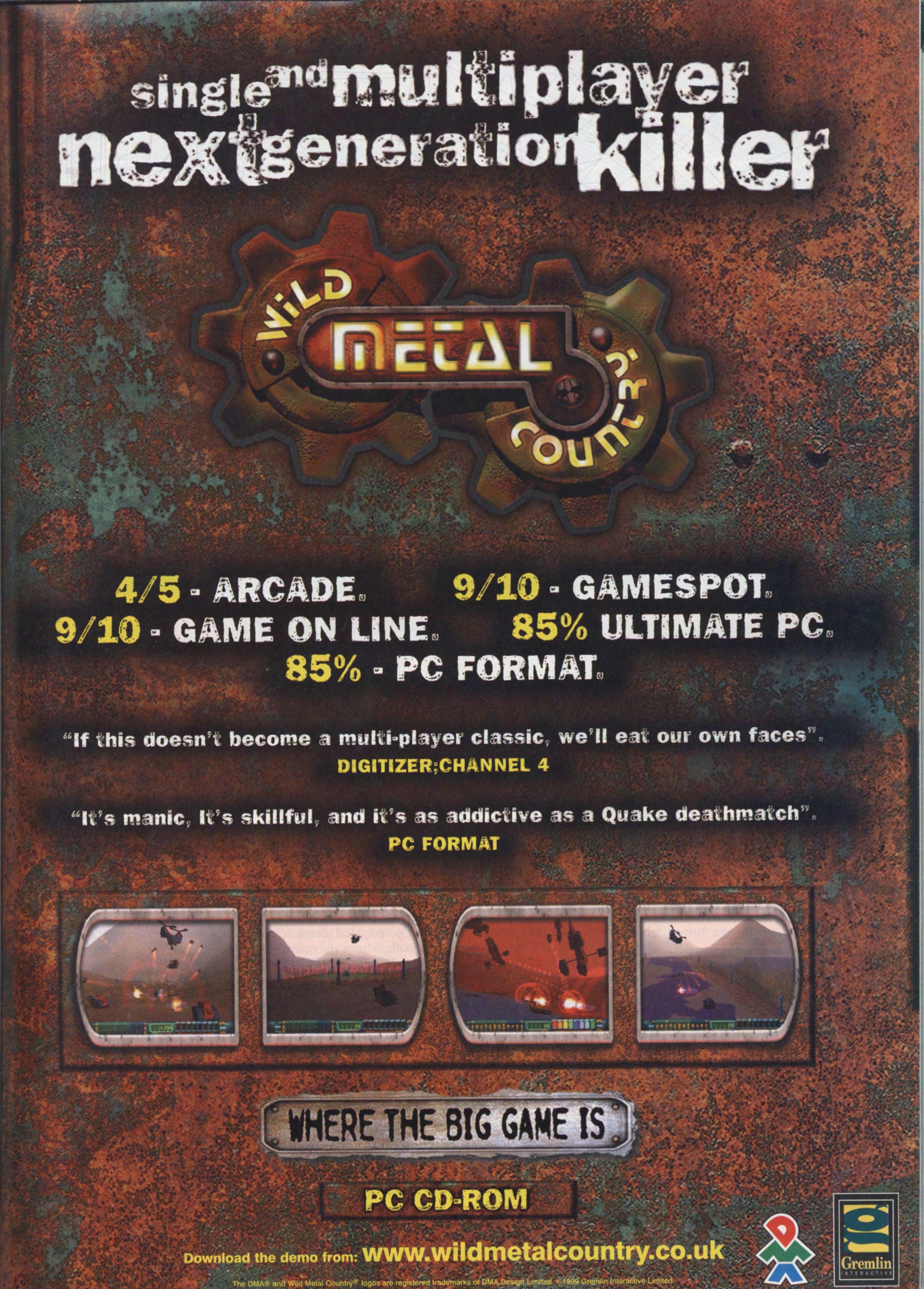 Tank games have been done to death, as have third-person shoot 'em ups. Wild Metal Country is a combination of both, and of course promises to be a whole new genre. Complete indifference is a natural reaction to this claim, although a few eyebrows may be raised on learning that the developers are none other than DMA, Dundee-based purveyors of the successful Grand Theft Auto, the undeniably good -but probably not quite as good as everyone made out - joyride 'em up.