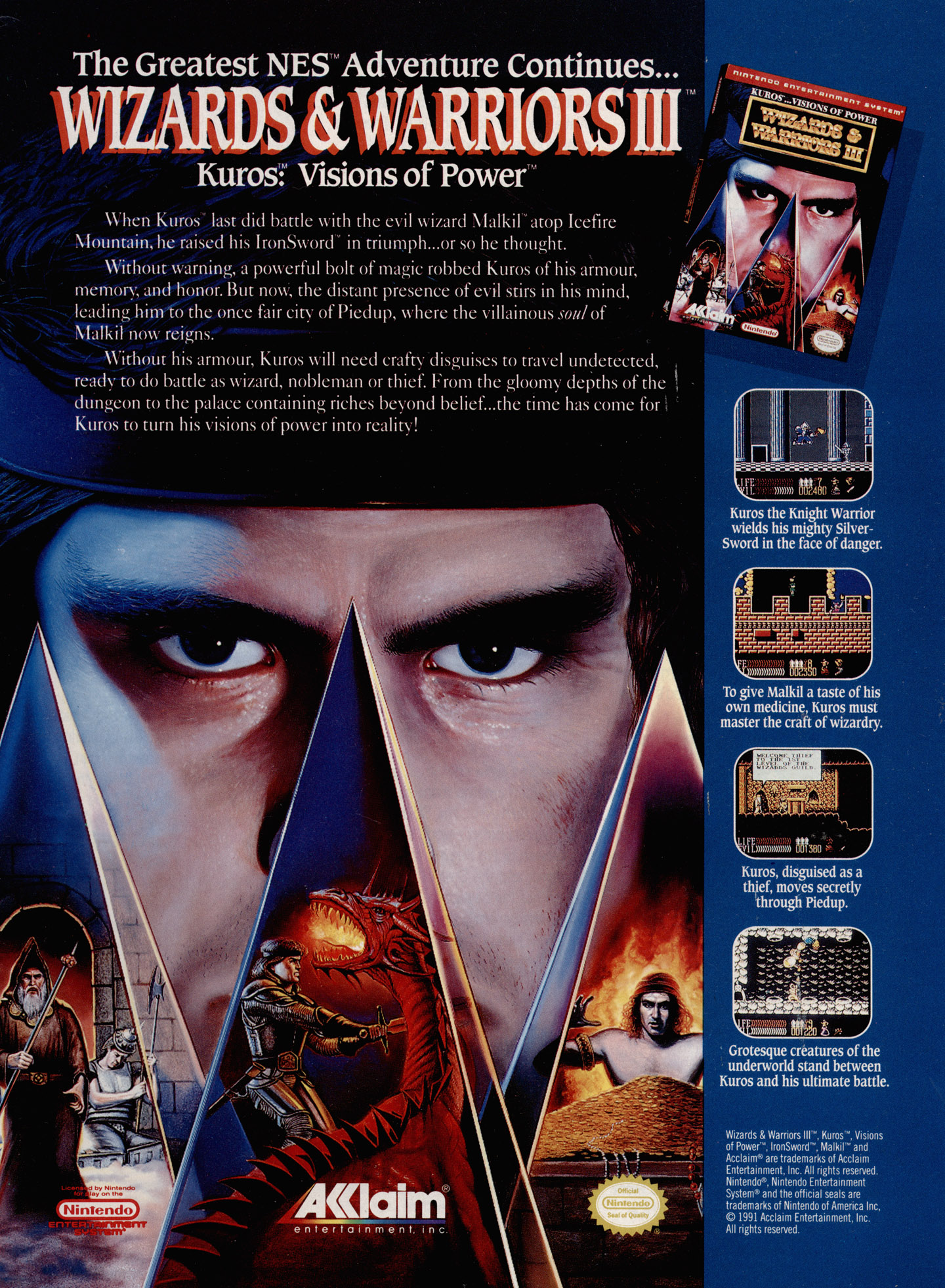 Two years ago atop Icefire Mountain, Kuros, the bravest, most popular, and best-dressed Nintendo Warrior of all time, triumphed over his arch-enemy, the dreaded Wizard Malkil. Little did NES players know that just after his defeat, Malki's ethereal spirit cast one last devastating superspell that shattered Kuros' mind, body, and soul. After months of agonized wandering in agony, Kuros has finally regained some degree of sanity just in time to find his worst nightmare has come true -- Malkil's back in town!