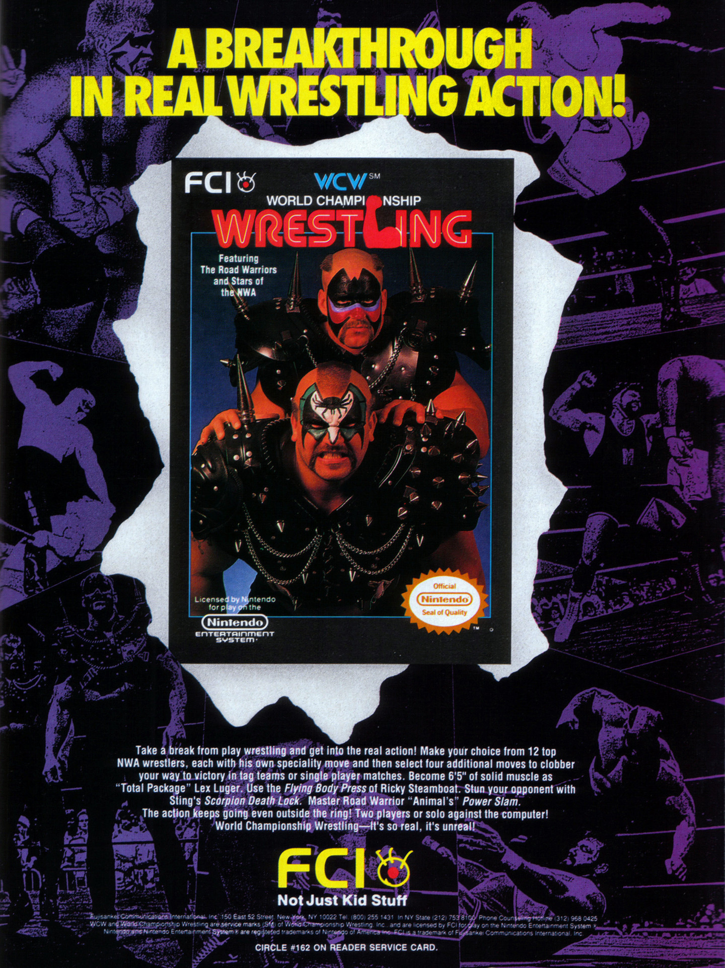 World Championship Wrestling from FCI introduces you to the rough and tumble NWA by enabling you to be one of the twelve most popular NWA wrestlers. Besides Ricky Steamboat, you'll recognize such greats as Road Warrior "Hawk" (whose favorite moves include the Brain Buster and the Boston Crab), Kevin Sullivan (who favors the Cranium Kick and the Cobra Twist) and Michael Hayes (who likes to wrestle opponents to the mat with the Atomic Drop and the One-Hand-Back-Breaker).